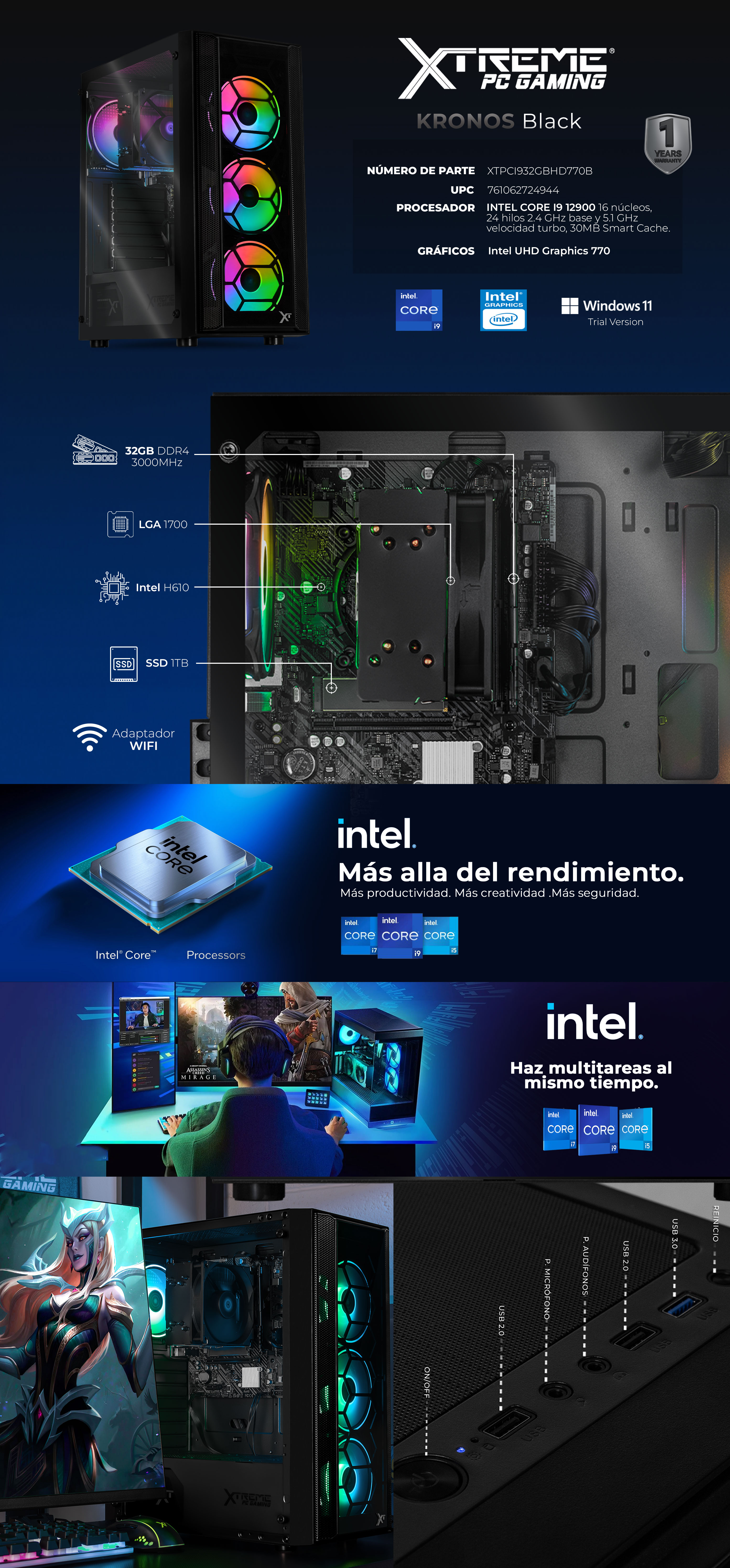 Equipada con un procesador Intel Core I9 12900 y gráficos integrados Intel UHD 770, este equipo ofrece un rendimiento fluido en tus juegos favoritos a 1080p. Con 32GB de RAM y un SSD de 1TB, tendrás suficiente velocidad y espacio para manejar múltiples tareas y disfrutar de una experiencia sin interrupciones.