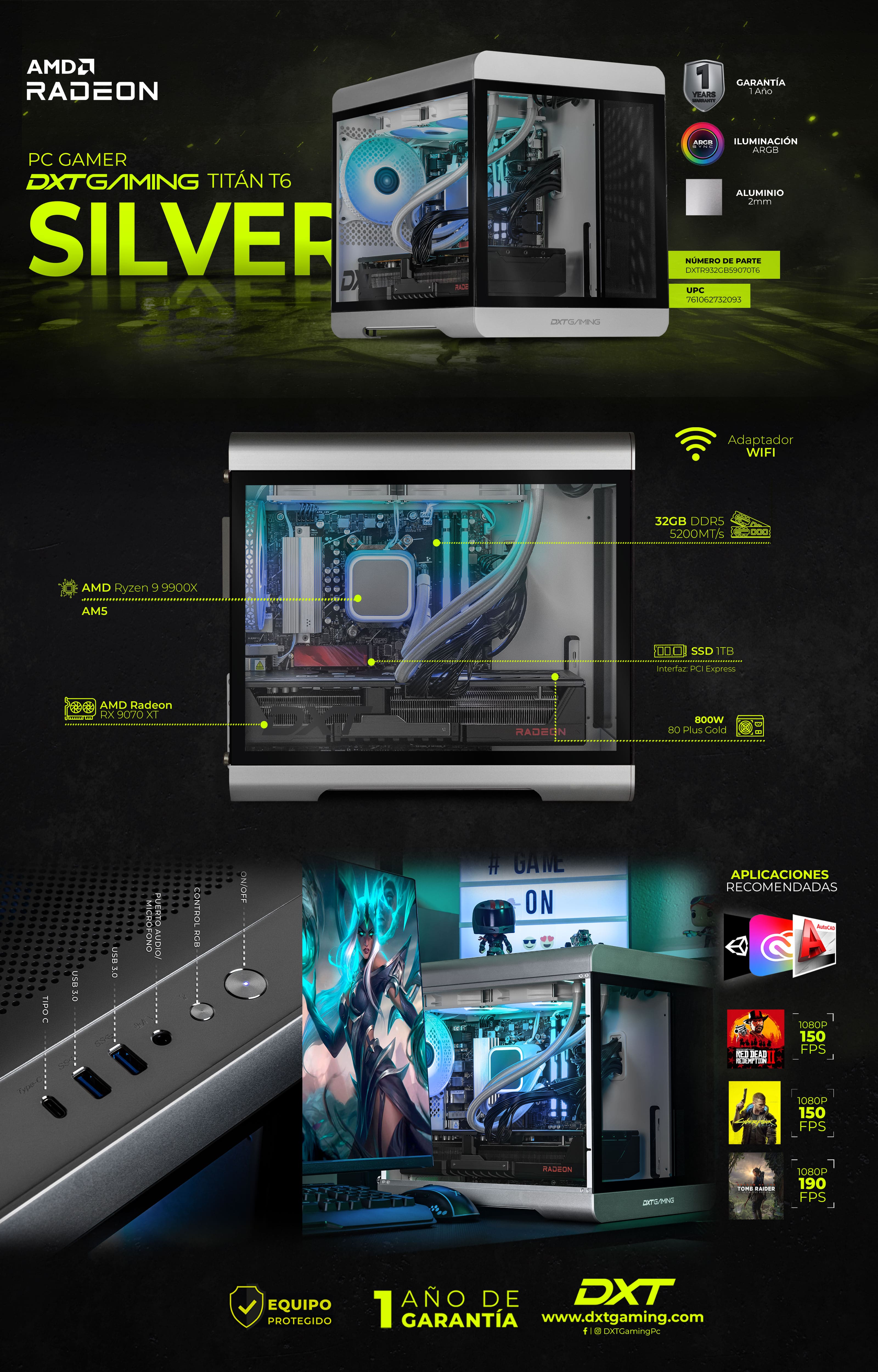 La DXT Top está diseñada para quienes buscan un rendimiento competitivo en eSports y juegos AAA exigentes. Equipada con la Radeon RX 9070 XT, el procesador AMD Ryzen 9 9900X y la tarjeta madre B650 AM5, ofrece potencia y estabilidad para gaming de alto nivel y transmisión en vivo.