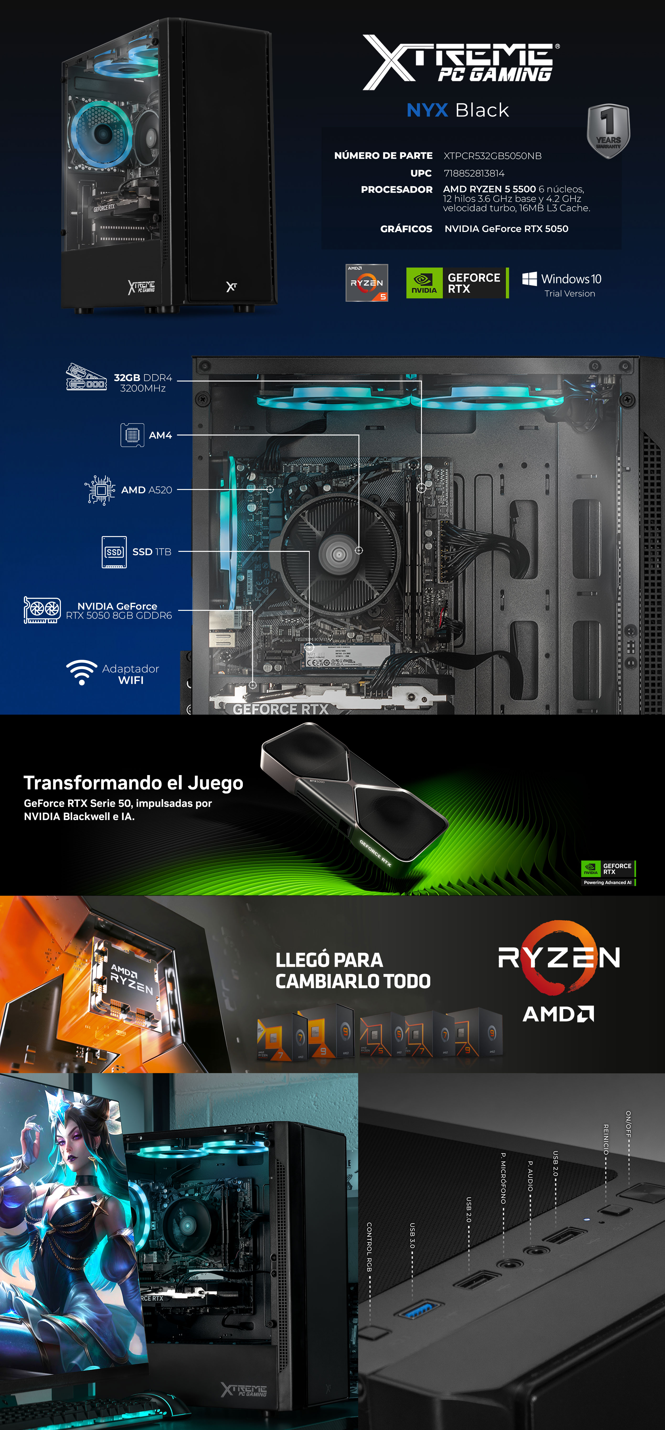 PC Gamer Xtreme PC Gaming NVIDIA GeForce RTX 5050 AMD Ryzen 5 5500 32GB SSD 1TB WIFI W10 Black gaming 1080p, estudios y multitarea