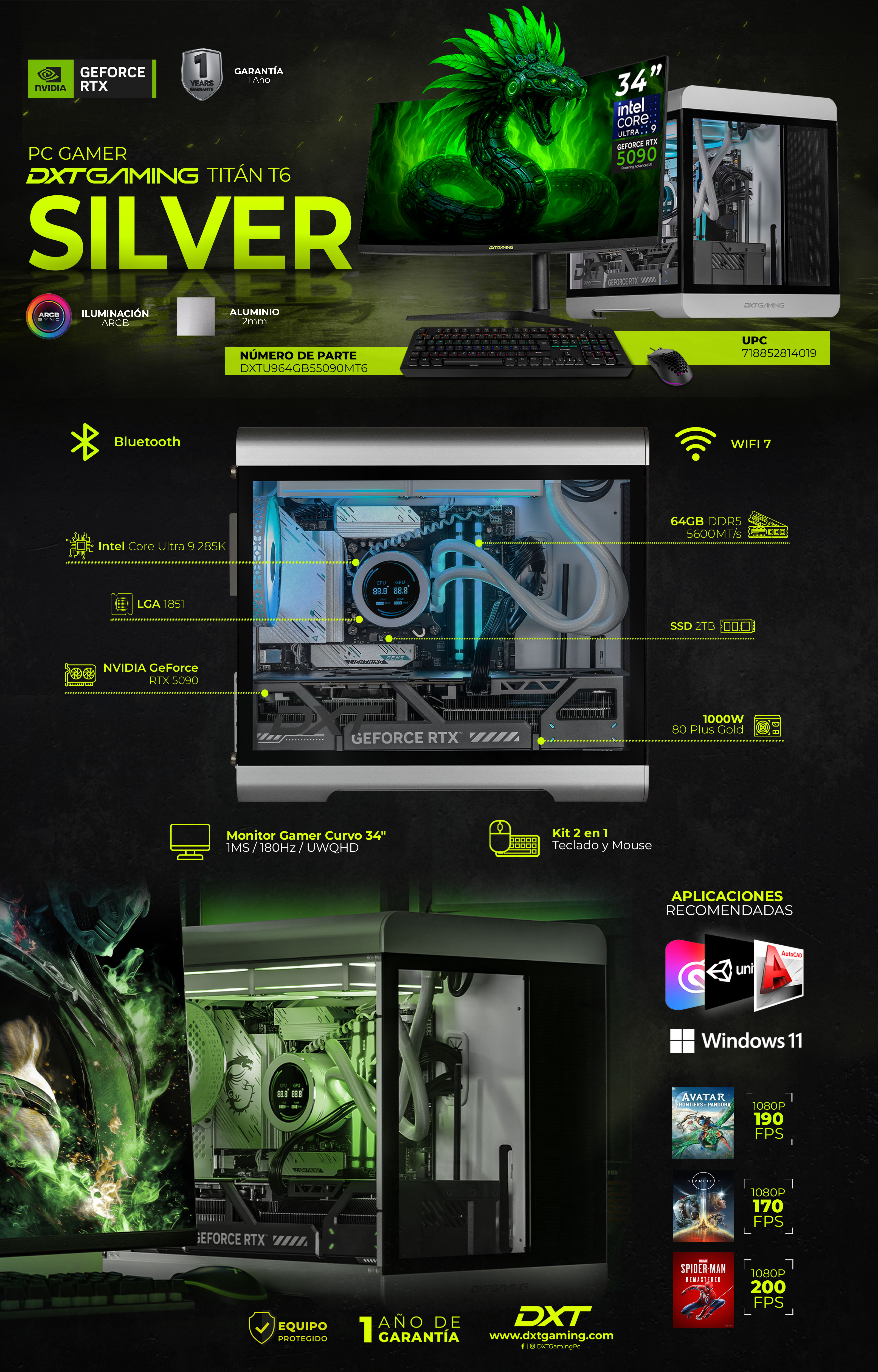 Impulsada por componentes Kingston, combina 64GB DDR5 y un SSD de 2TB, garantiza velocidad, fluidez y espacio para todos tus proyectos. El sistema líquido mantiene temperaturas óptimas incluso en sesiones intensas de juego o trabajo. Su fuente certificada de 1000W 80 Plus Gold brinda energía estable y eficiente, protegiendo los componentes y aumentando la durabilidad de tu inversión.
