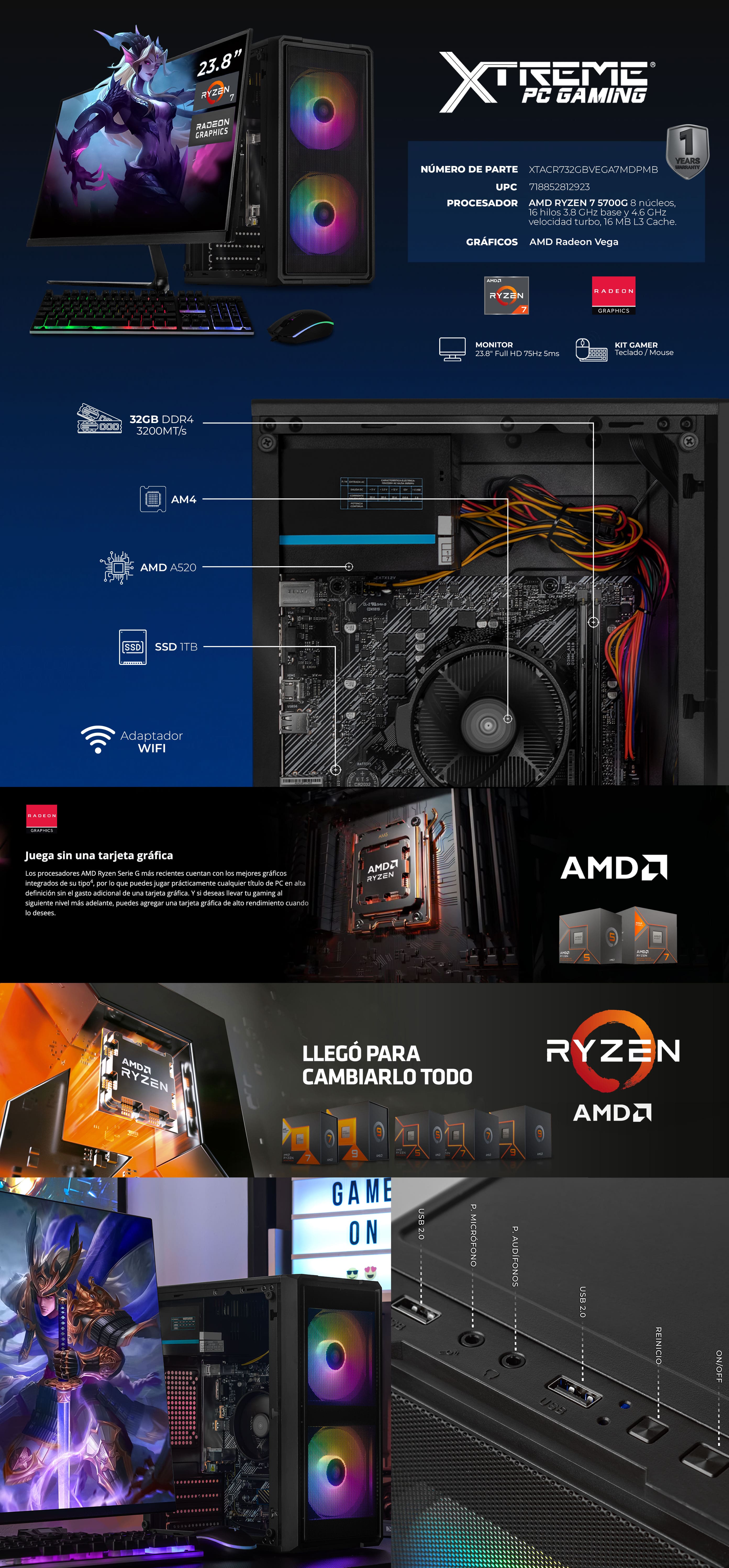Computadora Escritorio Completa Xtreme PC Gaming AMD Radeon Vega Renoir Ryzen 7 5700G 32GB SSD 1TB Monitor 23.8 75Hz WIFI Black gaming ligero en calidad baja, oficina, estudio y hogar