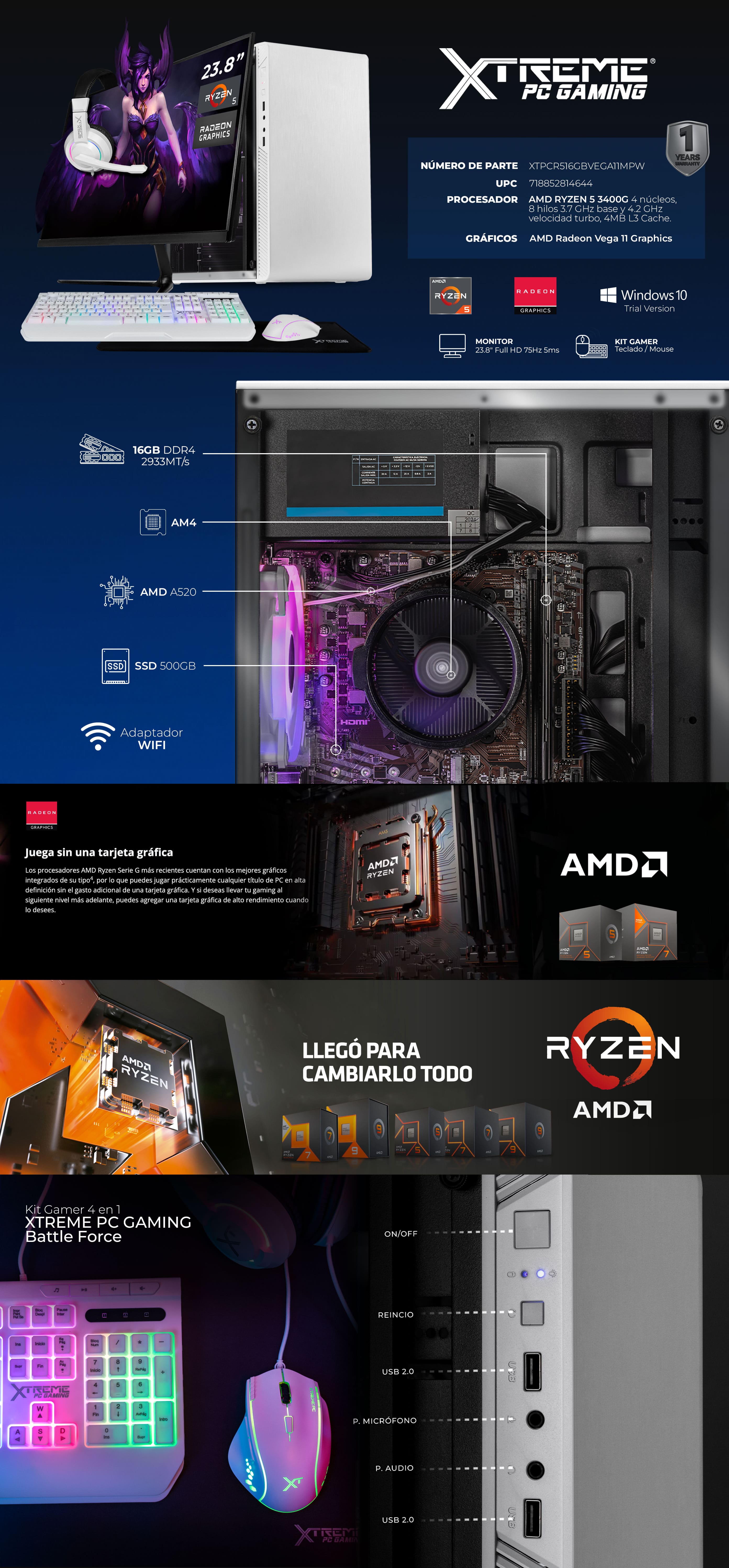 La Xtreme Lite es tu compañera ideal para el estudio, oficina y entretenimiento en casa. Equipada con el procesador AMD Ryzen 5 3400G, gráficos integrados Radeon Vega 11 y la tarjeta madre A520 AM4, es perfecta para ofimática, navegación y juegos ligeros.