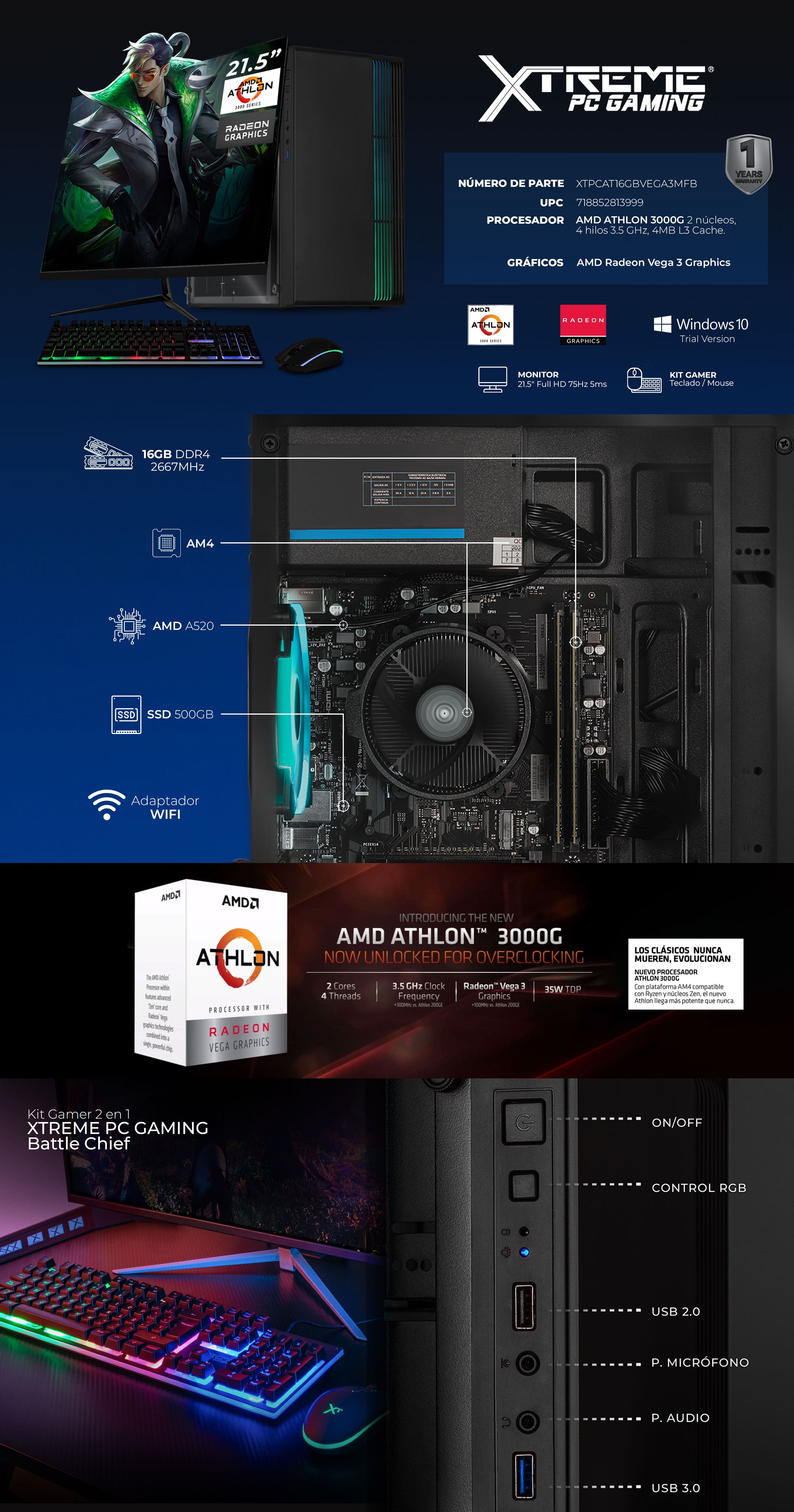 • Procesador eficiente: AMD Athlon 3000G (2 núcleos, 4 hilos, frecuencia base de 3.5 GHz).