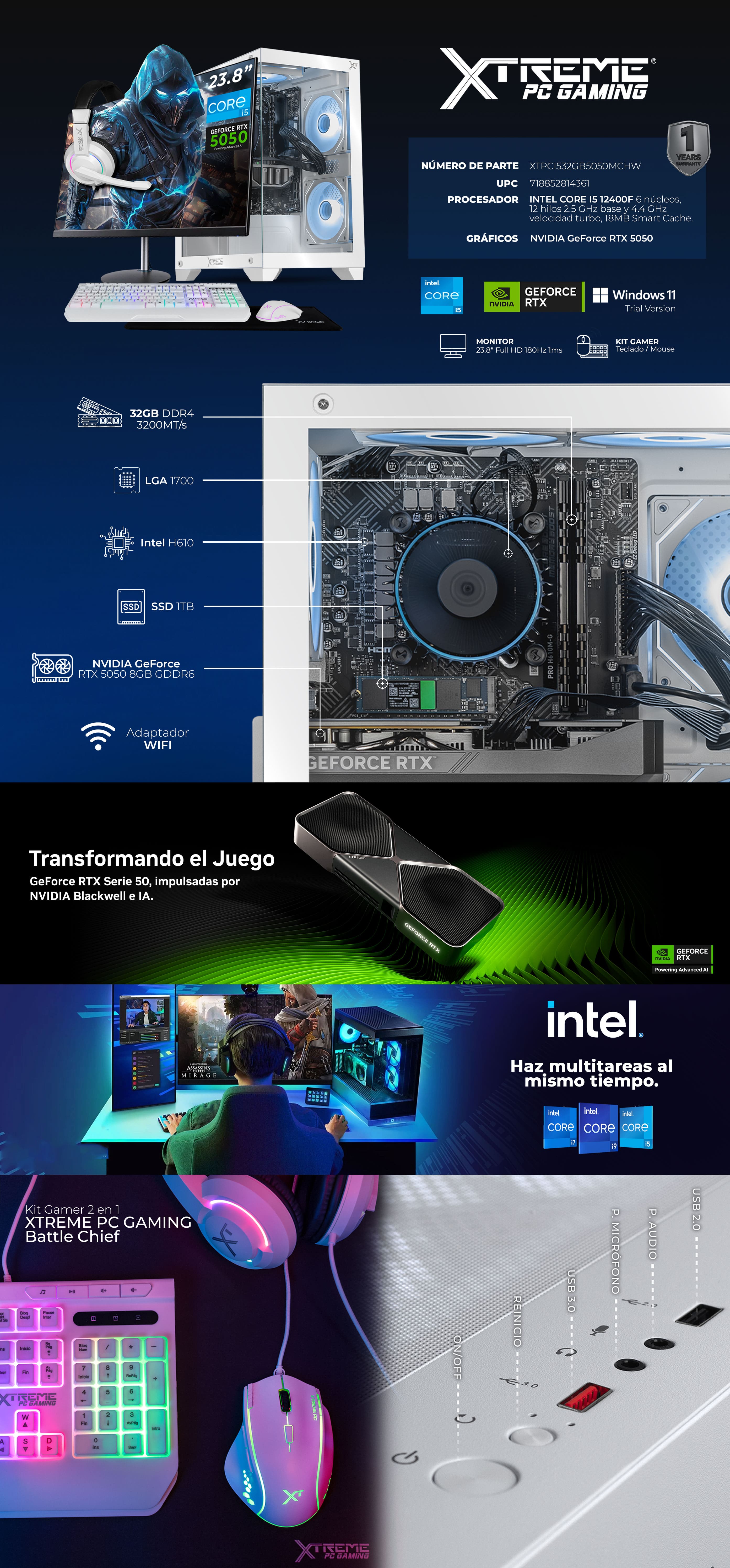 La Xtreme Starter es perfecta para quienes buscan su primera PC gamer accesible y confiable. Con el procesador Intel Core i5 12400F, la NVIDIA GeForce RTX 5050 y la tarjeta madre H610, tendrás rendimiento sólido en juegos como LoL, Roblox, Rocket League y Minecraft en 1080p.