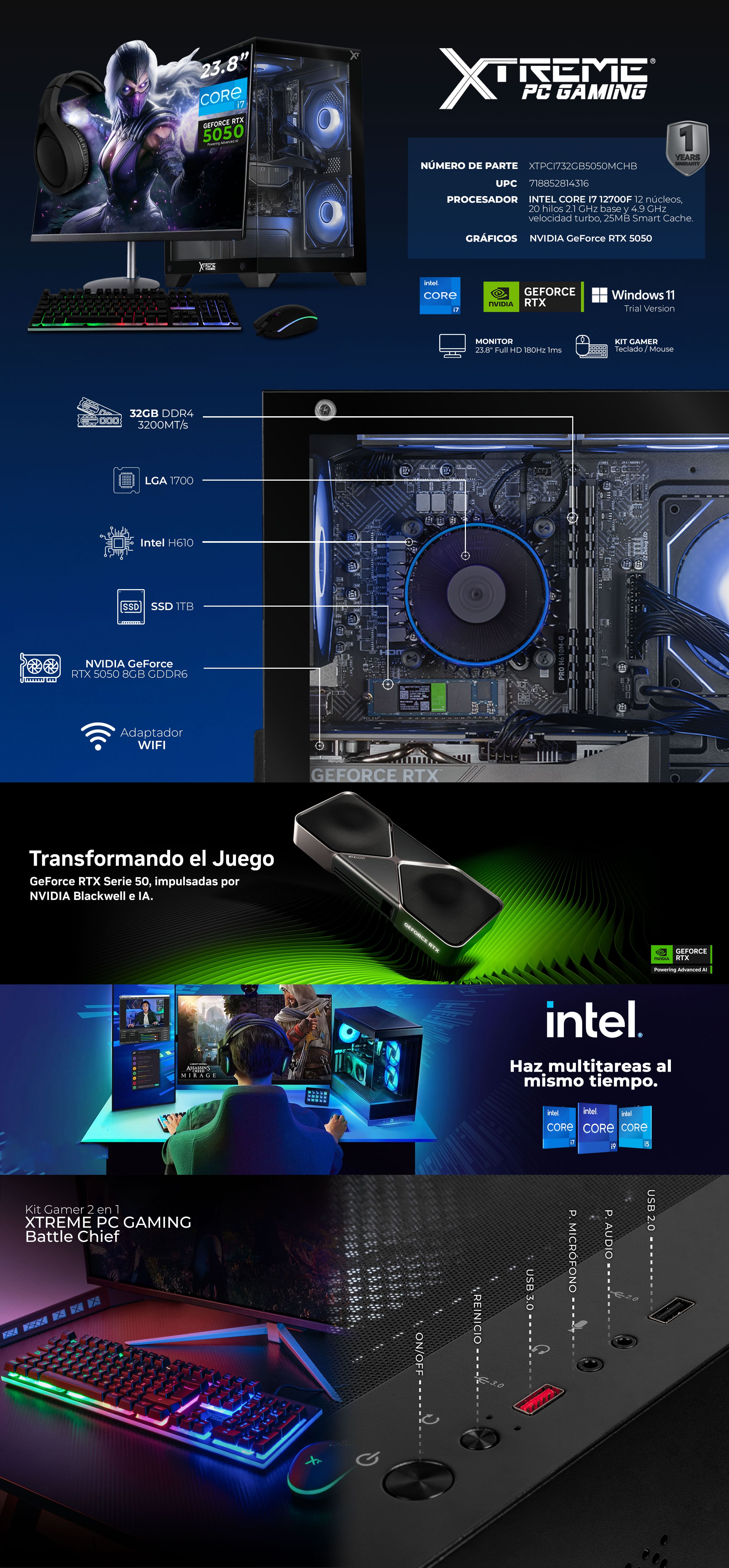 La Xtreme Starter es perfecta para quienes buscan su primera PC gamer accesible y confiable. Con el procesador Intel Core i7 12700F, la NVIDIA GeForce RTX 5050 y la tarjeta madre H610, tendrás rendimiento sólido en juegos como LoL, Roblox, Rocket League y Minecraft en 1080p.