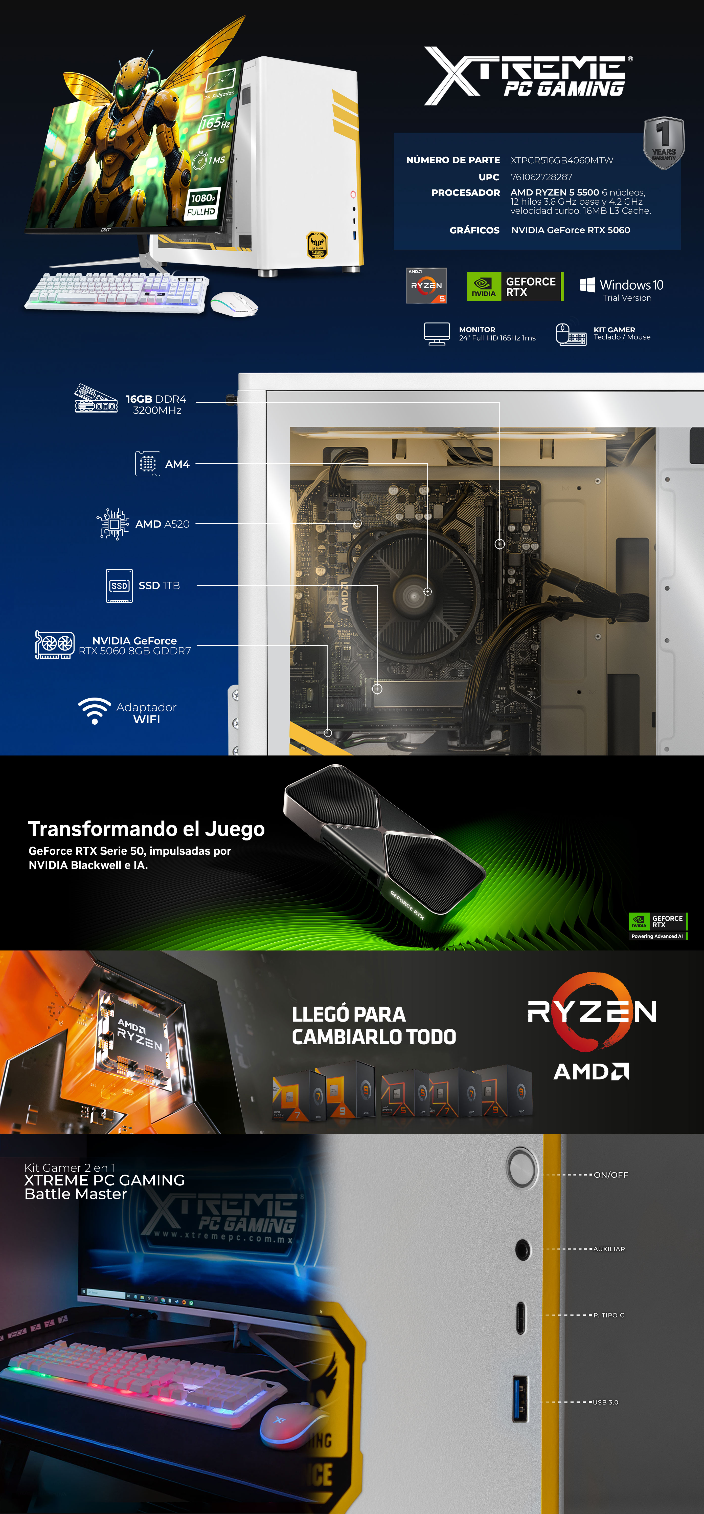 Be a Xtremer, elegir tu PC nunca había sido tan fácil. En Xtreme PC Gaming lo hacemos simple: Integramos equipos con lo último en tecnología, componentes originales y listos para usarse. Cada PC está respaldada por Xtreme Shield, con 12 meses de garantía y soporte técnico de por vida. Creamos experiencias inolvidables para gamers, profesionales y entusiastas, con potencia, calidad y pasión en cada detalle.