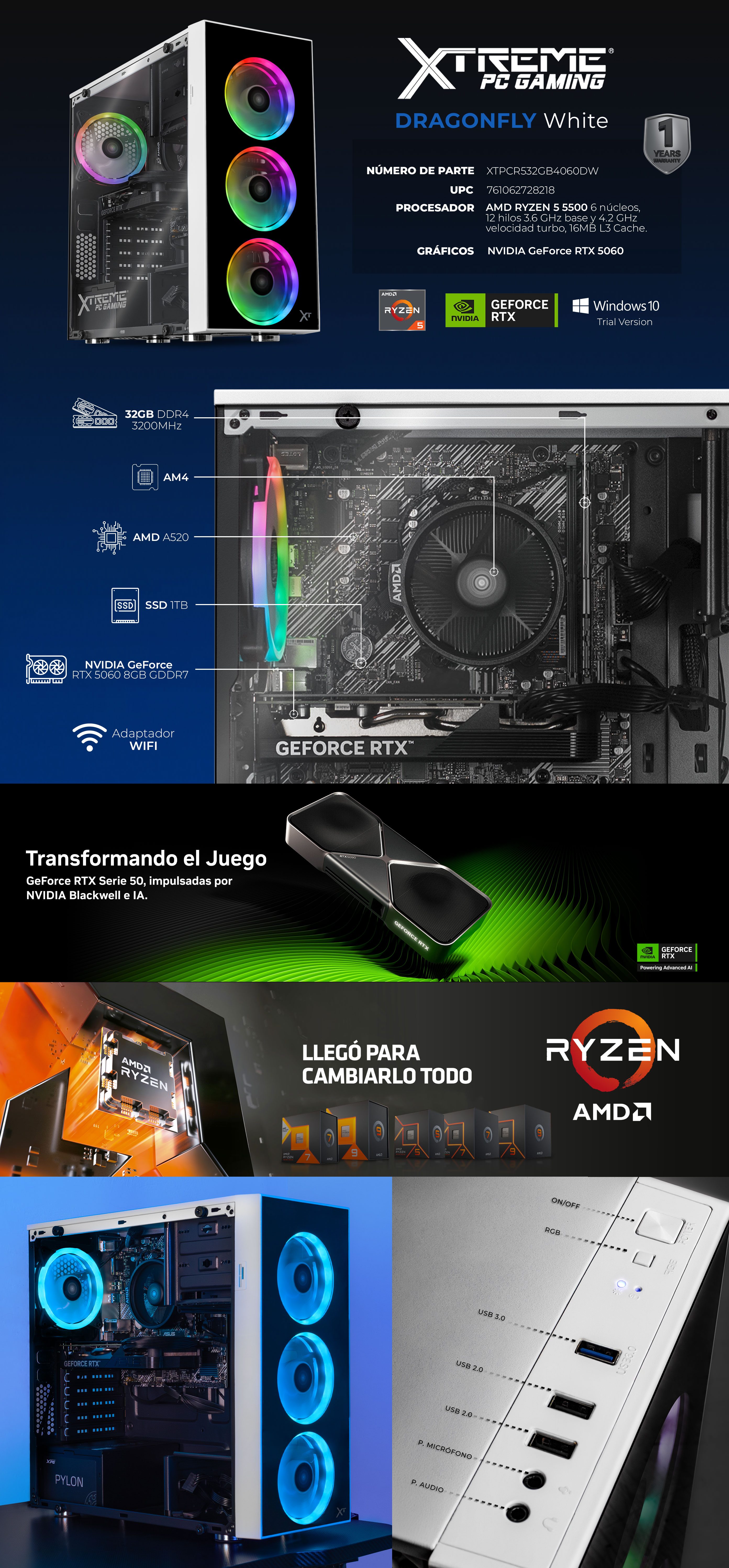 Con 32GB y un SSD de 1TB, ofrece arranques rápidos, multitarea confiable y almacenamiento para tus juegos y proyectos. Su gabinete gamer con panel de cristal y RGB convierte tu espacio en un verdadero setup. La fuente de 600W 80 Plus Bronze aporta energía estable y segura, mientras que el adaptador WiFi asegura conectividad inmediata.