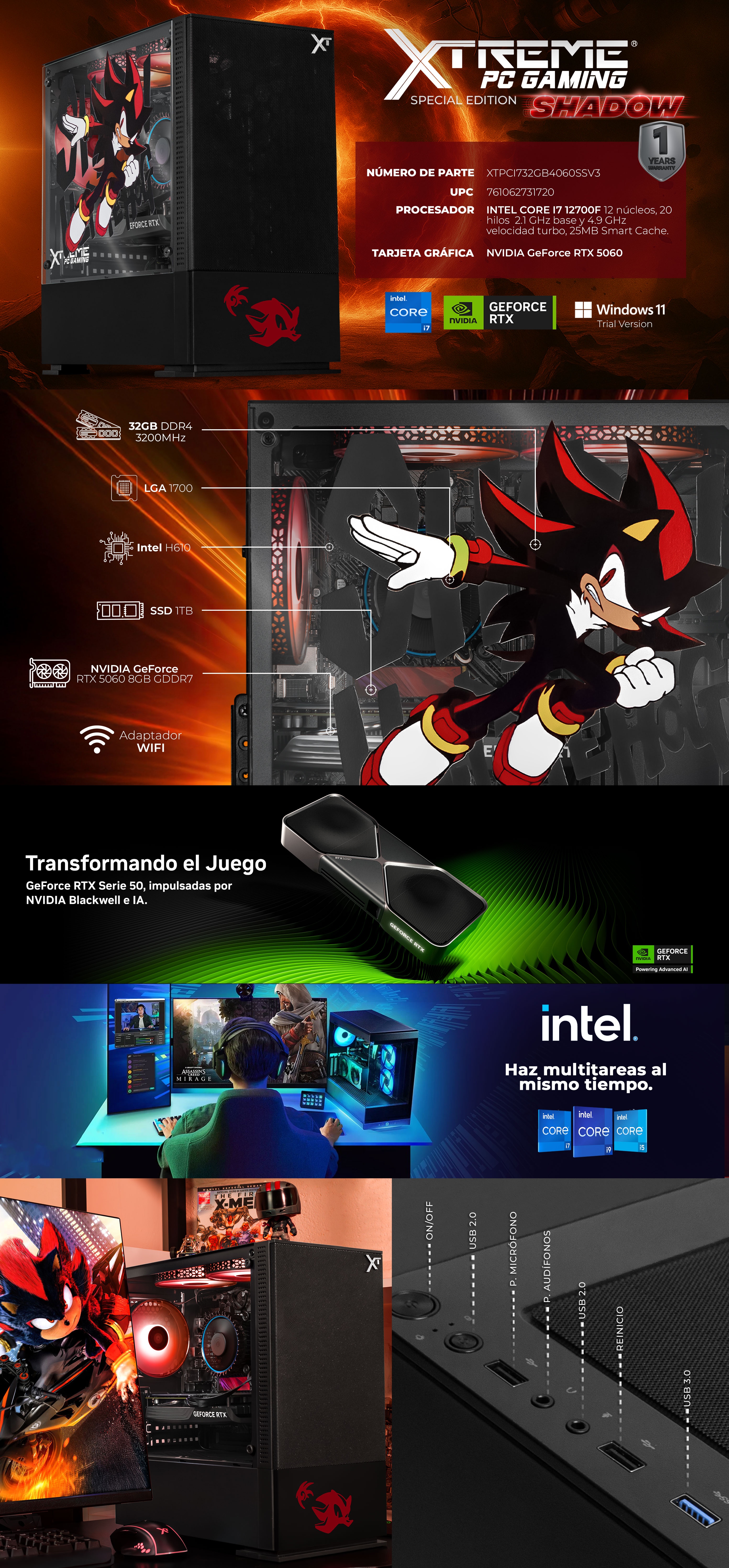 PC Gamer Xtreme PC Gaming NVIDIA GeForce RTX 5060 Intel Core i7 12700F 32GB SSD 1TB WIFI W11 Sonic Shadow gaming competitivo y streaming