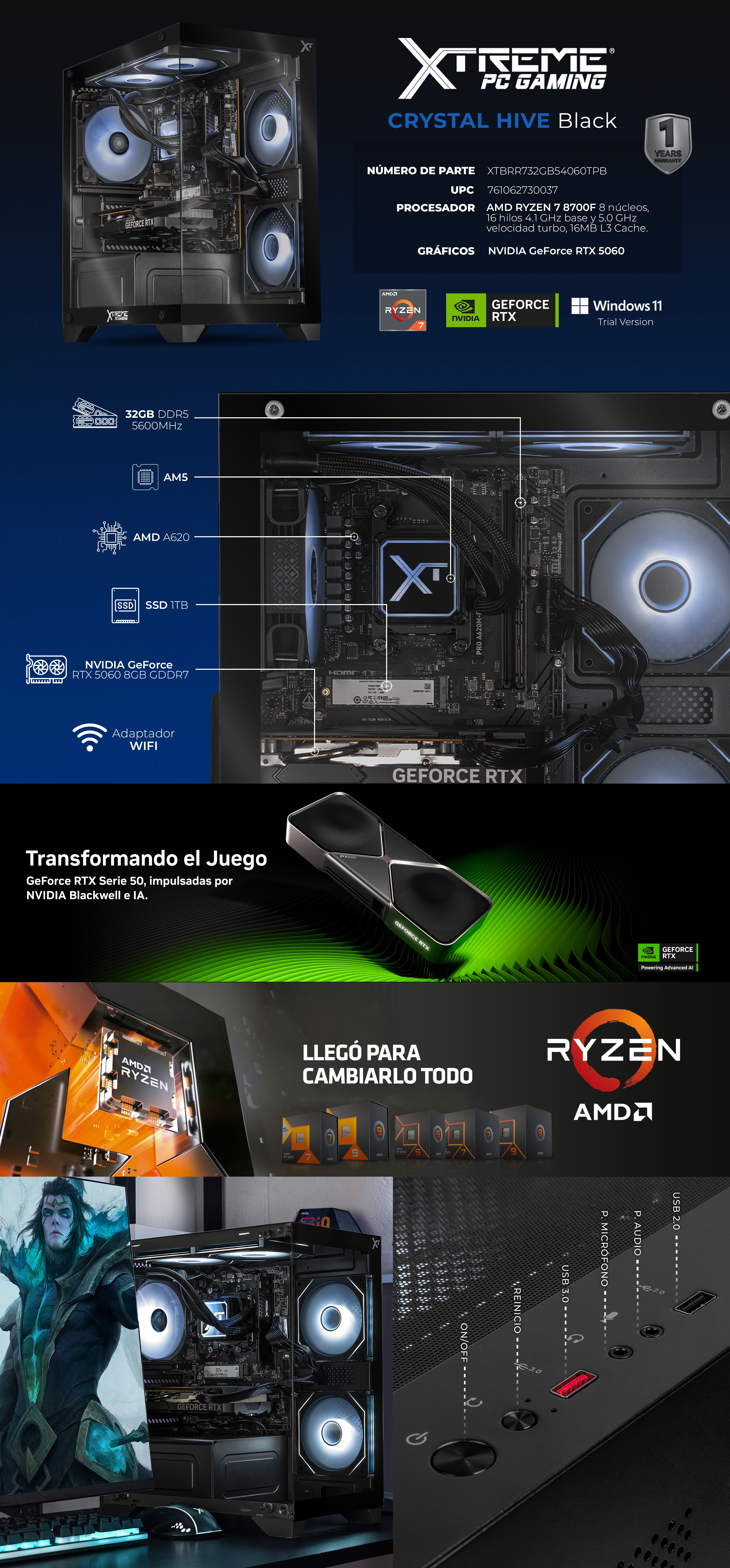 La Xtreme Top está diseñada para quienes buscan un rendimiento competitivo en eSports y juegos AAA exigentes. Equipada con la NVIDIA RTX 5060, el procesador AMD Ryzen 7 8700F y la tarjeta madre A620 AM5, ofrece potencia y estabilidad para gaming de alto nivel y transmisión en vivo.