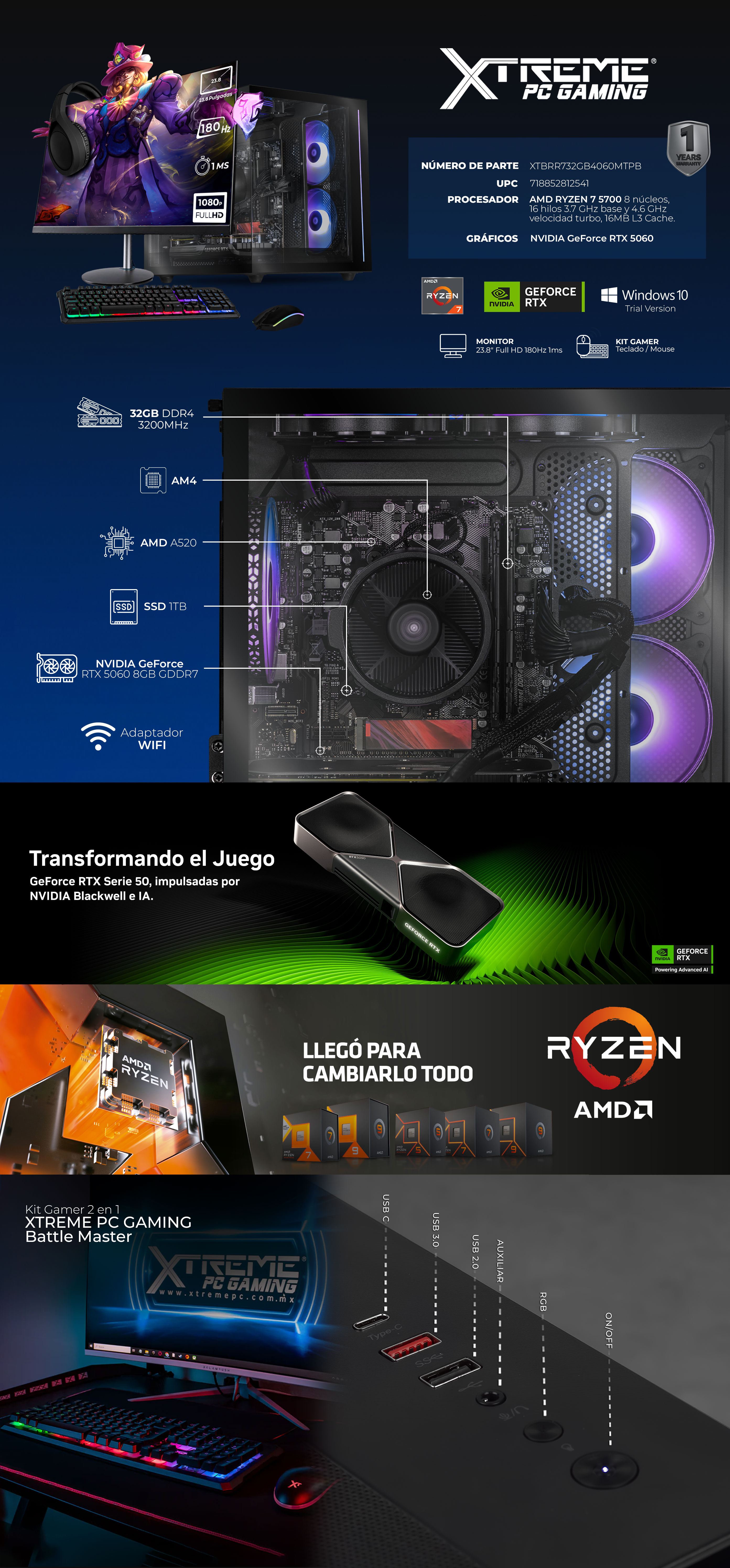 La Xtreme Top está diseñada para quienes buscan un rendimiento competitivo en eSports y juegos AAA exigentes. Equipada con la NVIDIA RTX 5060, el procesador AMD Ryzen 7 5700 y la tarjeta madre A520 AM4, ofrece potencia y estabilidad para gaming de alto nivel y transmisión en vivo.