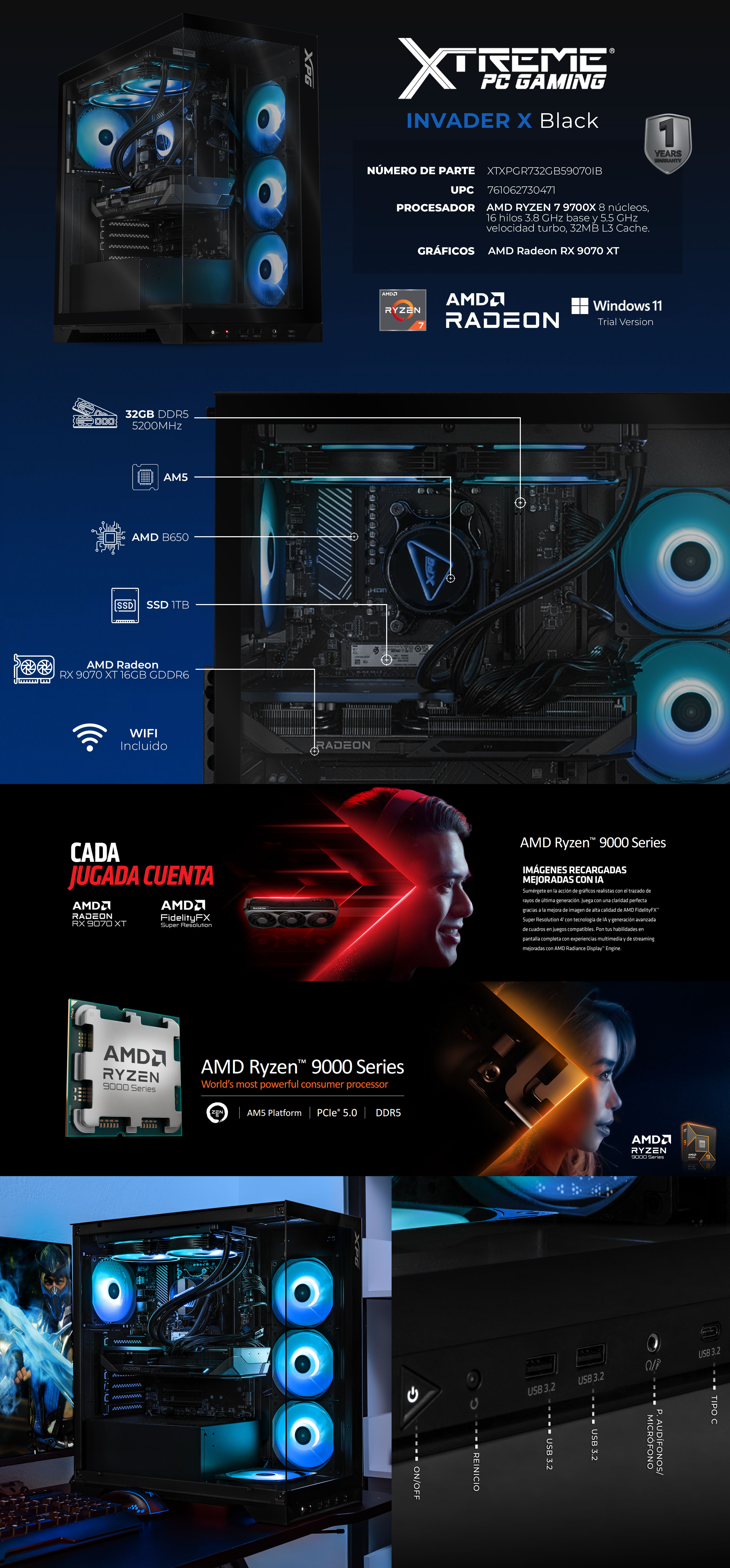 La Xtreme Top está diseñada para quienes buscan un rendimiento competitivo en eSports y juegos AAA exigentes. Equipada con la Radeon RX 9070 XT, el procesador AMD Ryzen 7 9700X y la tarjeta madre B650 AM5, ofrece potencia y estabilidad para gaming de alto nivel y transmisión en vivo.