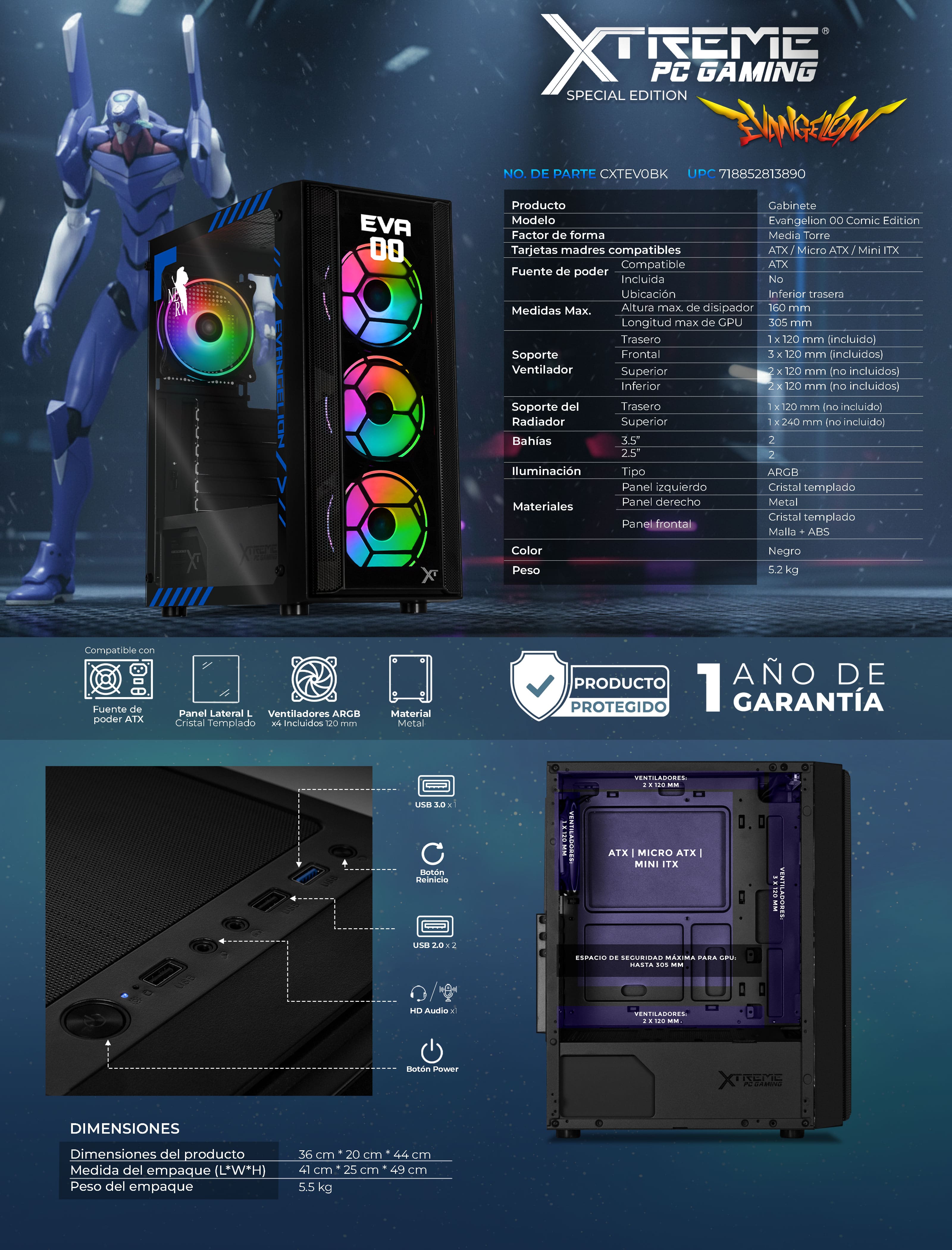 El Evangelion 00 Comic Edition es el gabinete ideal para construir un setup con estilo y potencia inspirados en el universo Evangelion. Su estructura metálica sólida de 0.5 mm de grosor, panel lateral de cristal templado e iluminación ARGB lo convierten en una pieza imponente dentro de cualquier entorno gamer.