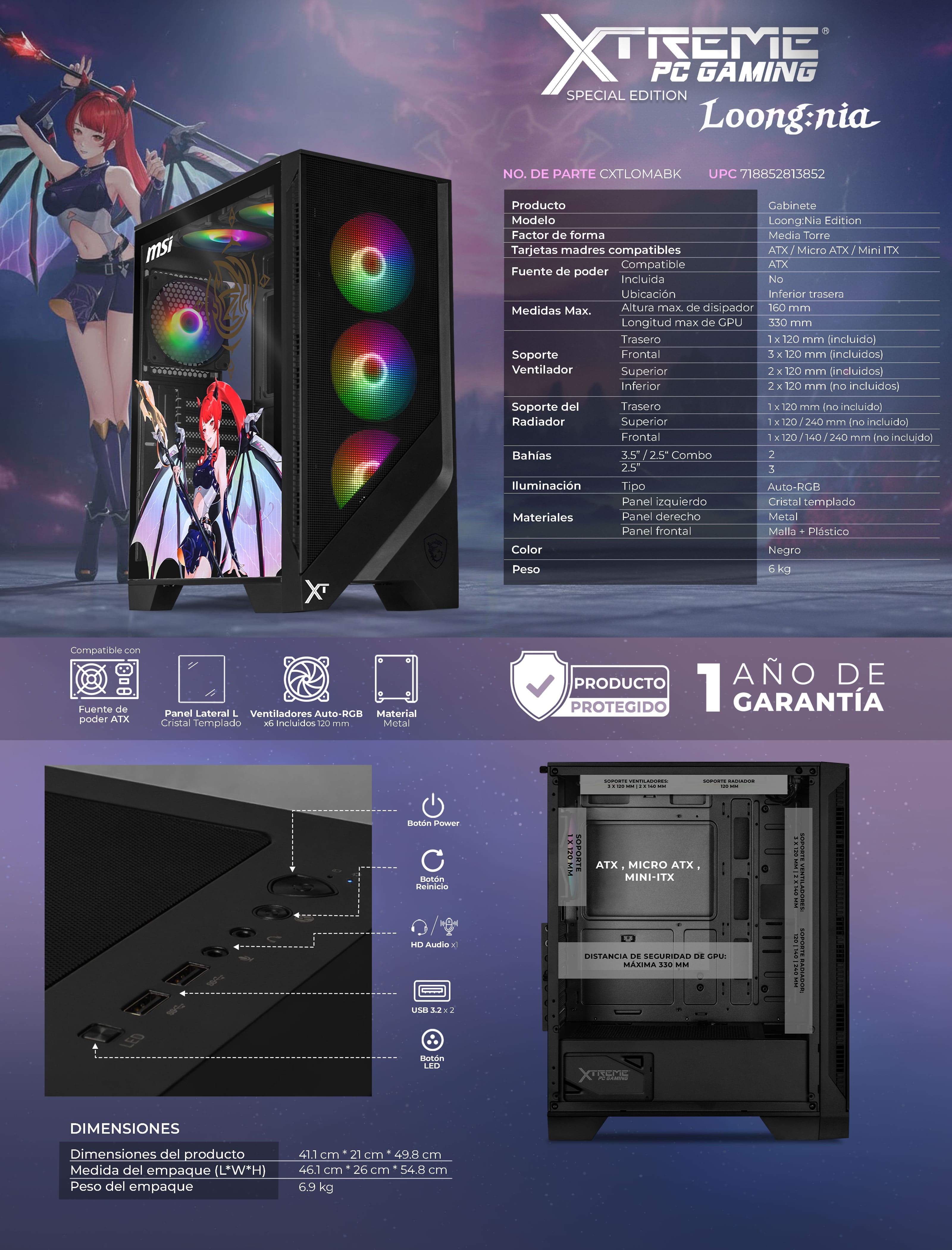 El Loong:Nia Edition es el gabinete ideal para setups potentes, visualmente impactantes y con un estilo que refleja el espíritu gamer al máximo. Su estructura metálica sólida de 0.5 mm de grosor, panel lateral de cristal templado y sistema de iluminación RGB lo convierten en una pieza central dentro de cualquier entorno de alto rendimiento.