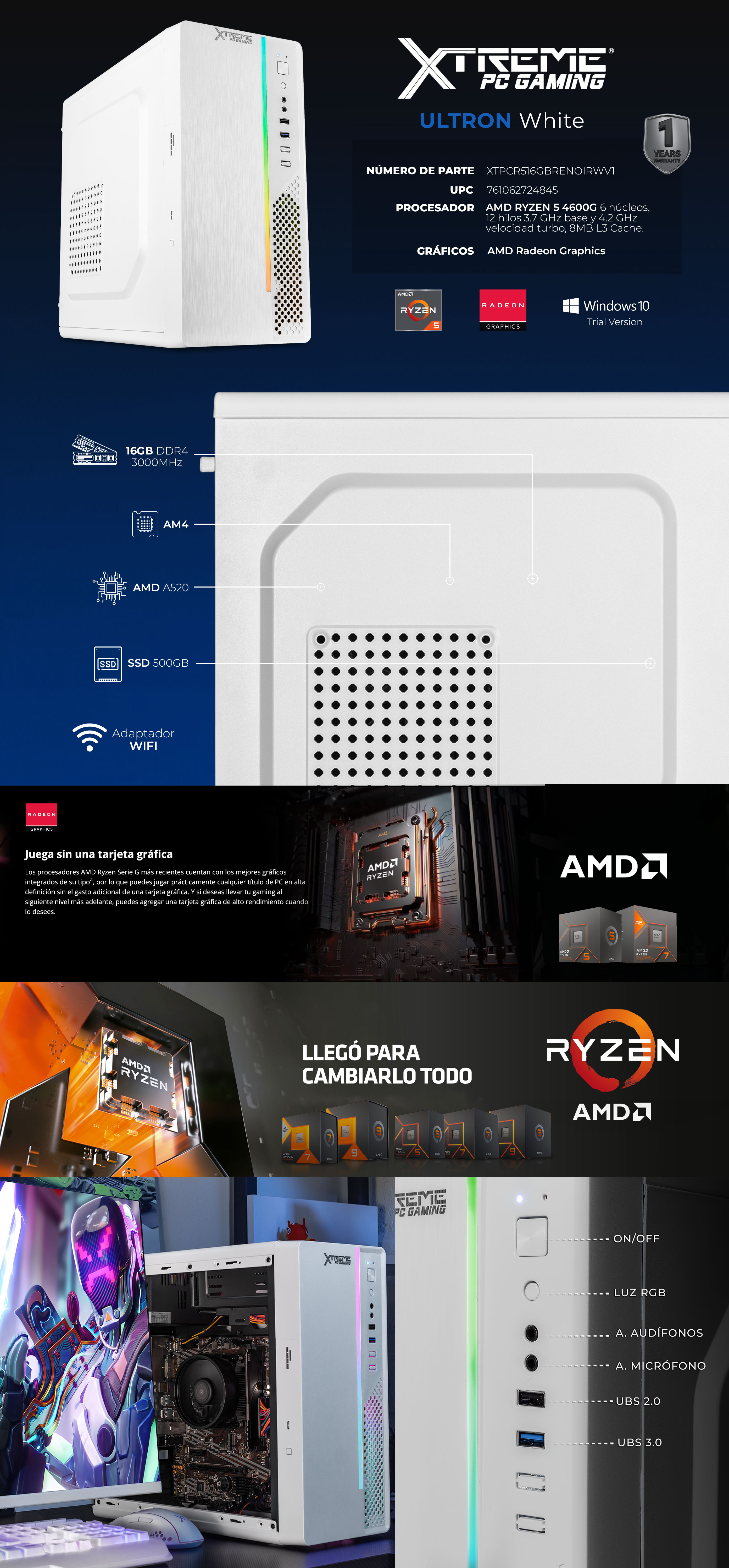 AMD Ryzen 5 4600G con 6 núcleos y 12 hilos 3.7 GHz de velocidad y 4.2 GHz velocidad turbo con 8MB L3 en Cache, convirtiendo tu PC en una máquina para derrotar a tus oponentes.