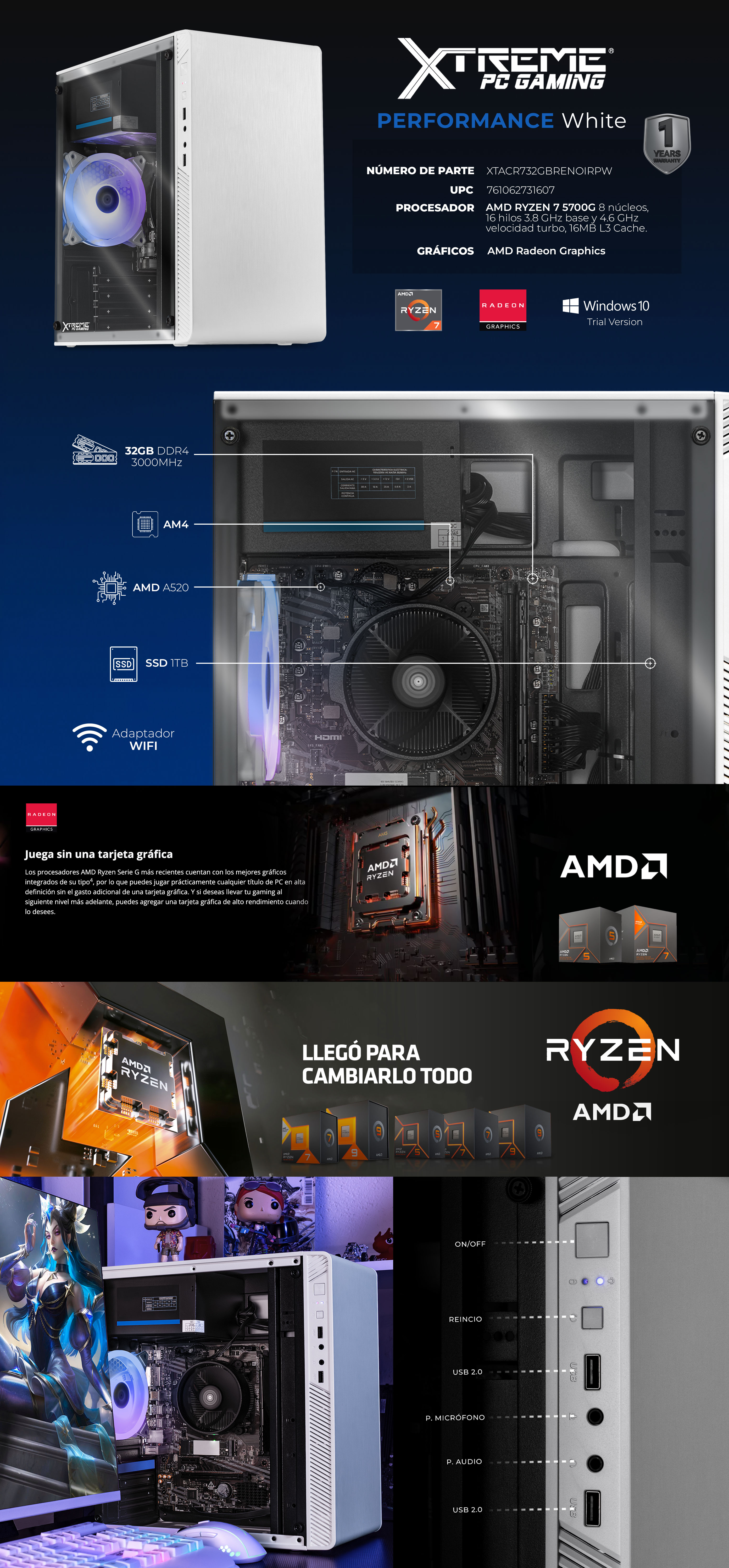 Equipada con un procesador AMD Ryzen 7 5700G y gráficos integrados Radeon Vega, este equipo ofrece un rendimiento fluido en tus juegos favoritos a 1080p. Con 32GB de RAM y un SSD de 1TB, tendrás suficiente velocidad y espacio para manejar múltiples tareas y disfrutar de una experiencia sin interrupciones.