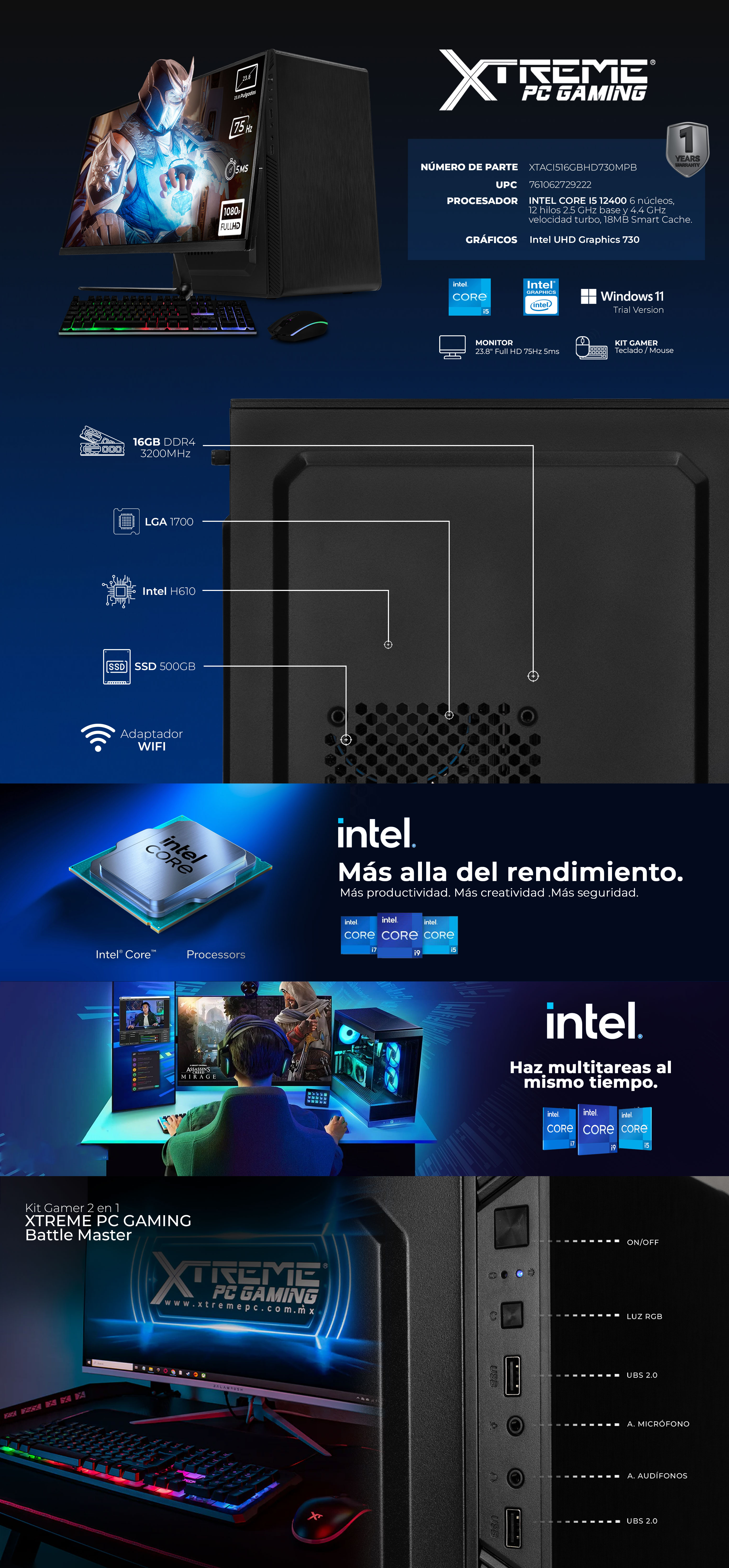 Equipada con un procesador Intel Core i5 12400 y gráficos integrados Intel UHD 730, este equipo ofrece un rendimiento fluido en tus juegos favoritos a 1080p. Con 16GB de RAM y un SSD de 500GB, tendrás suficiente velocidad y espacio para manejar múltiples tareas y disfrutar de una experiencia sin límites.