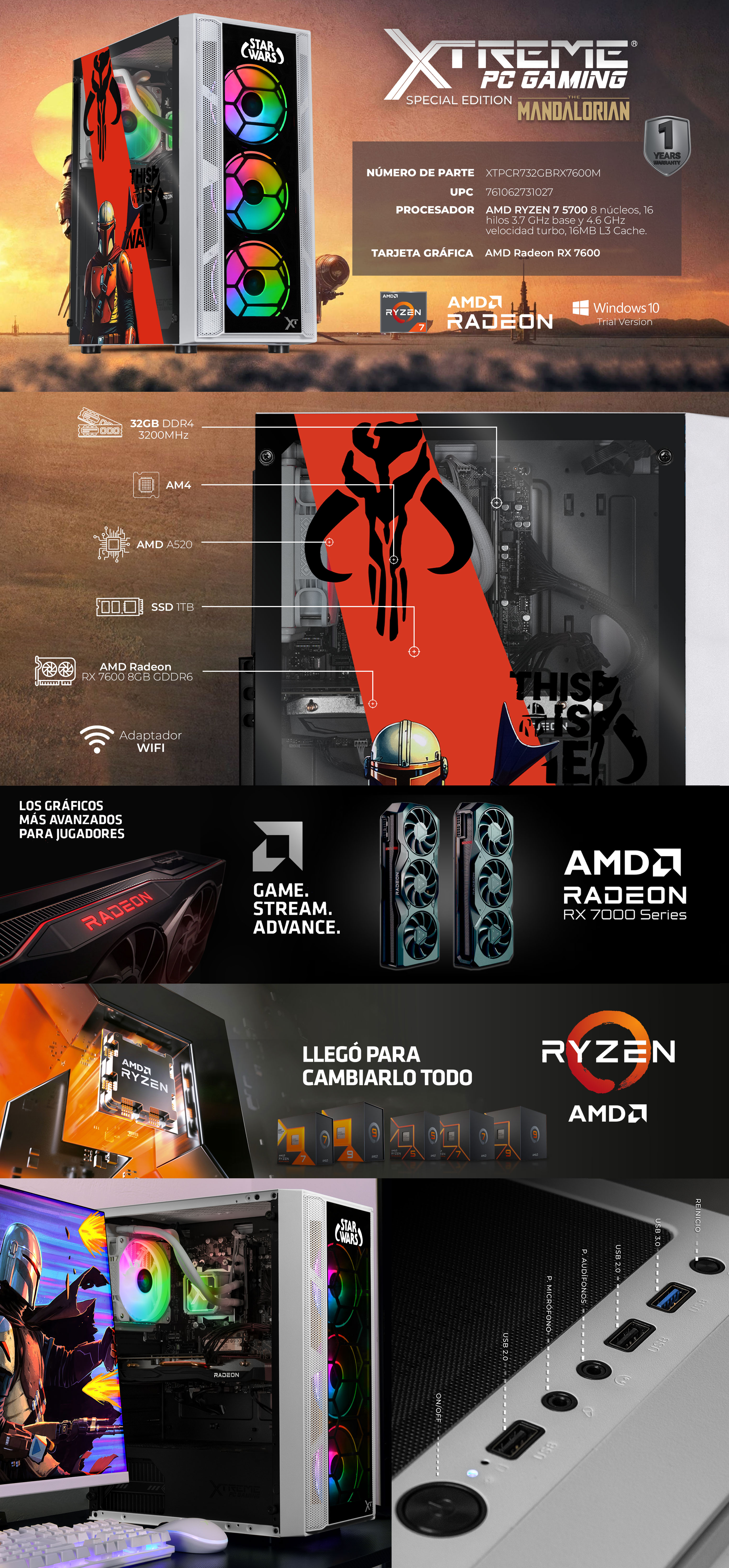 Xtreme PC Gaming AMD Radeon RX 7600 Ryzen 7 5700 32GB SSD 1TB Sistema Liquido WIFI Mandalorian