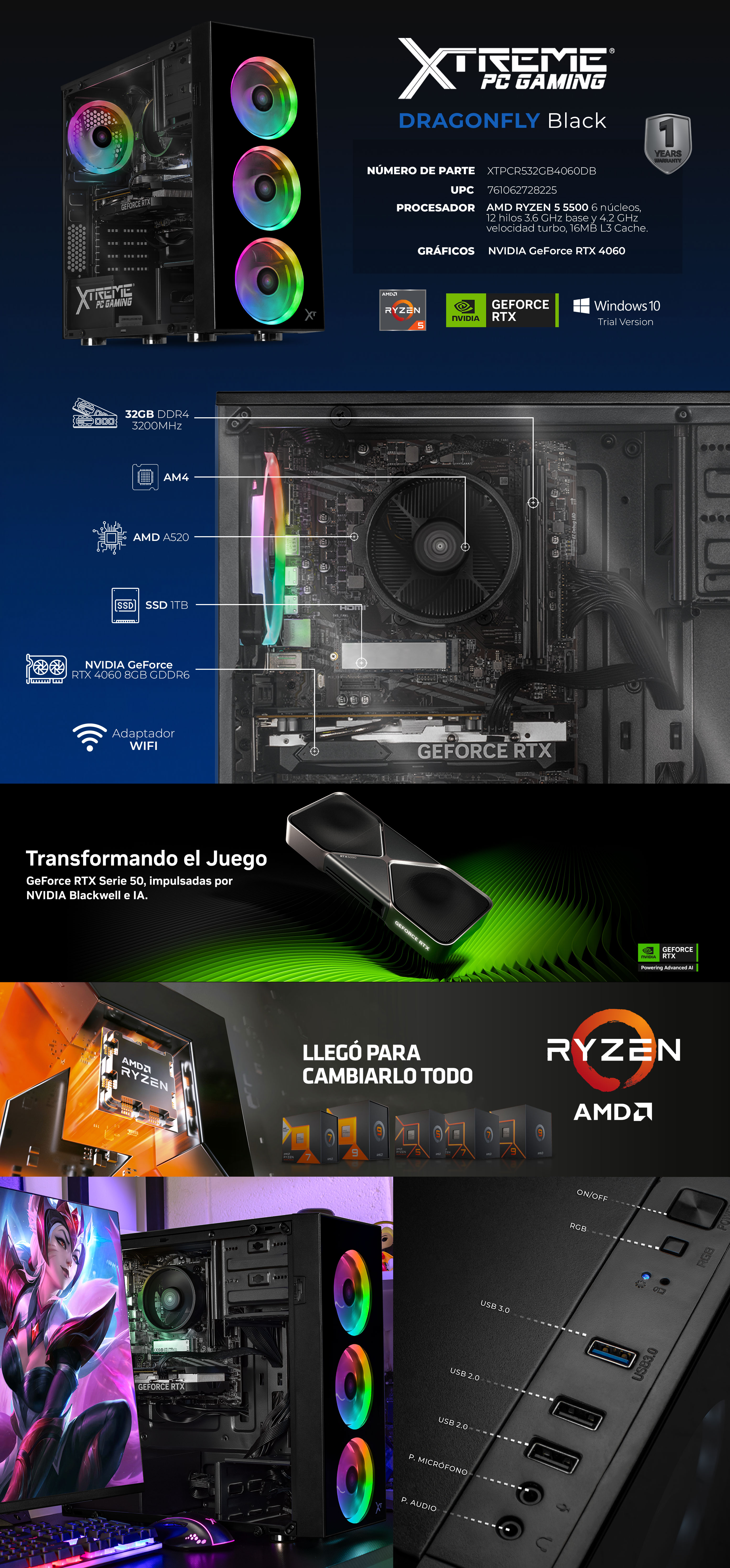 PC Gamer Xtreme PC Gaming NVIDIA GeForce RTX 5060 AMD Ryzen 5 5500 32GB SSD 1TB WIFI W10 Black gaming 1080p, estudios y multitarea