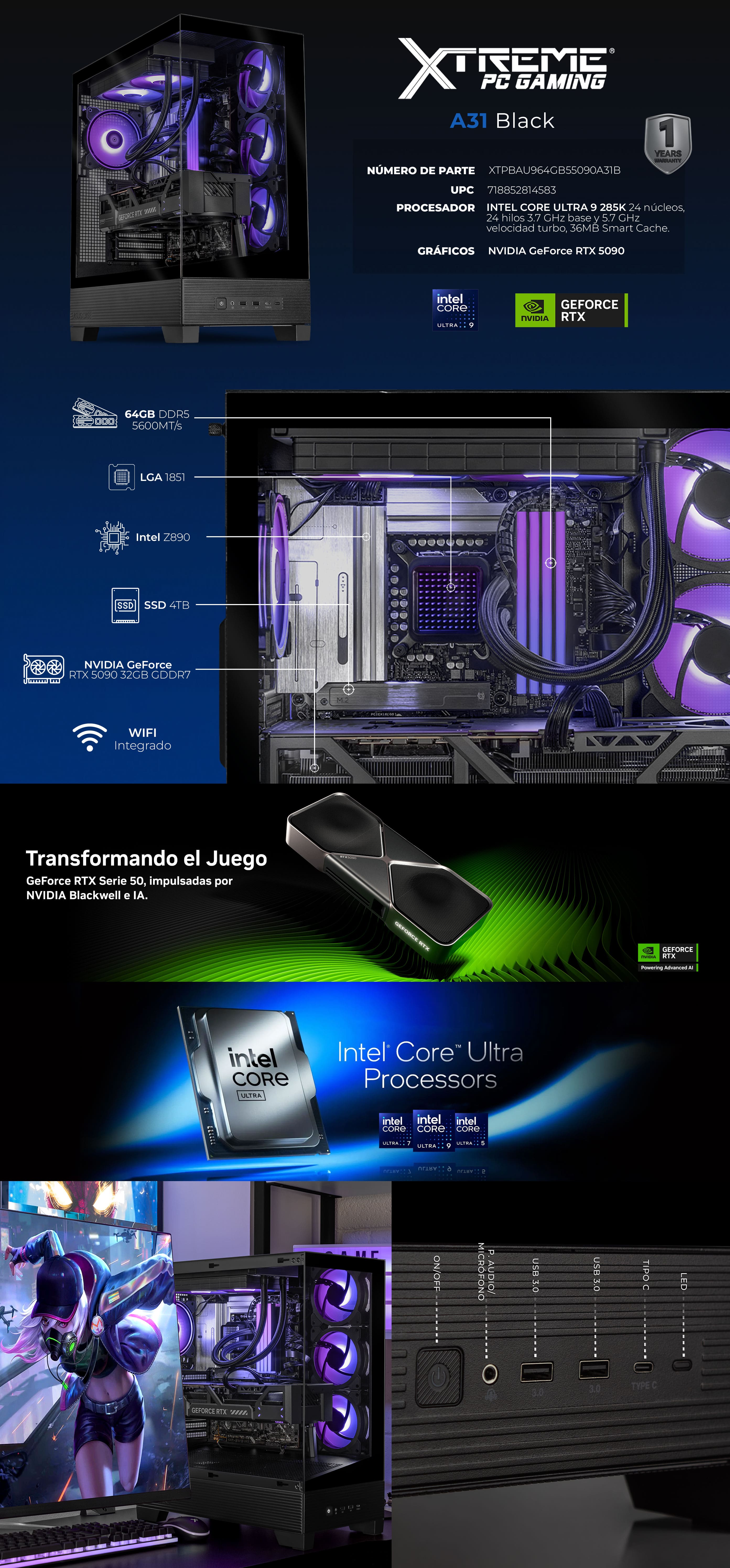 La Xtreme Ultra combina lo mejor de la nueva generación en una PC lista para el futuro. Con la potencia impulsada por IA de la NVIDIA RTX 5090, el procesador Intel Core Ultra 9 285K y la tarjeta madre Z890 LGA 1851, disfruta de gráficos ultrarrealistas, FPS altísimos y multitarea sin límites para gaming y creación de contenido profesional.