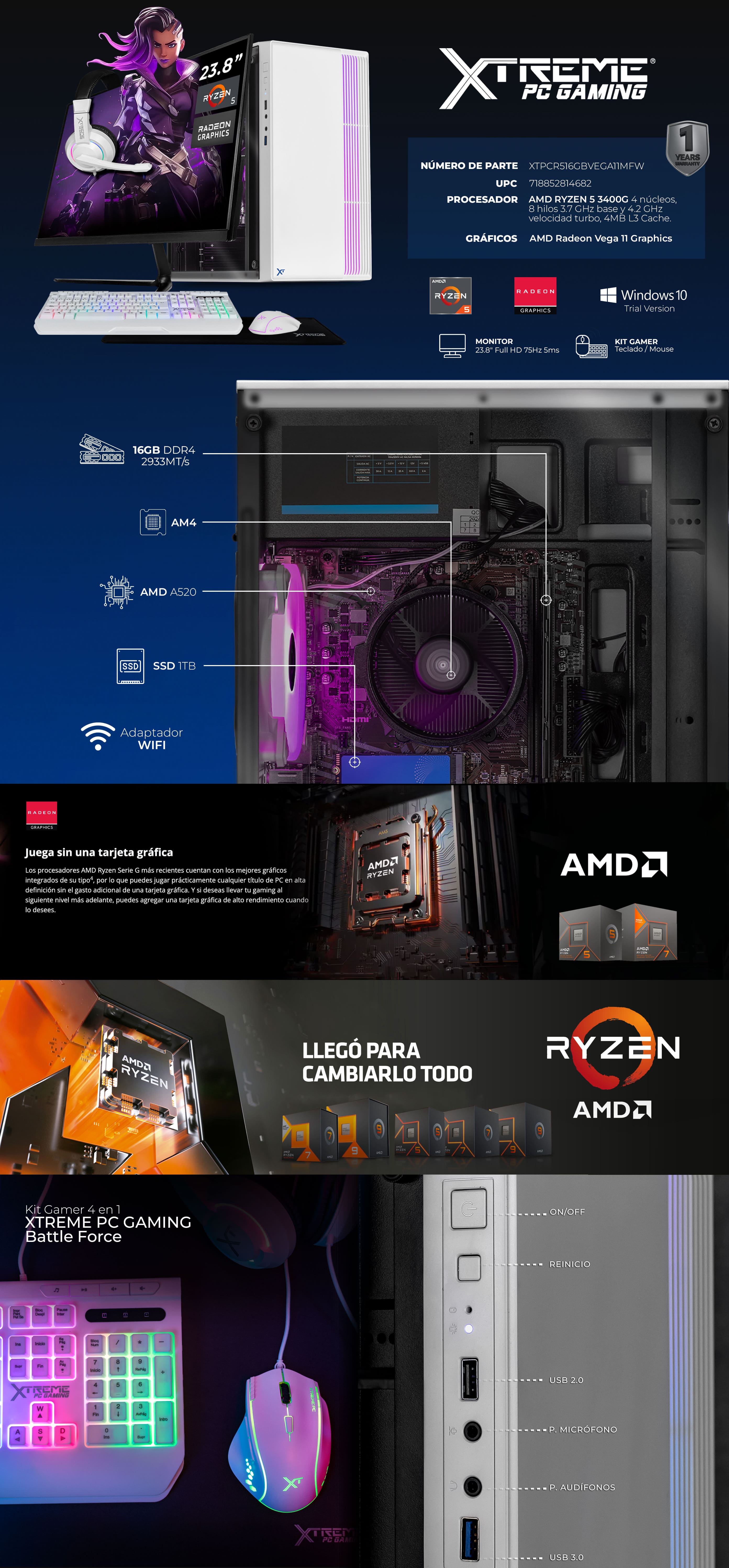 • Procesador eficiente: AMD Ryzen 5 3400G (4 núcleos, 8 hilos, frecuencia base de 3.7 GHz, boost hasta 4.2 GHz).