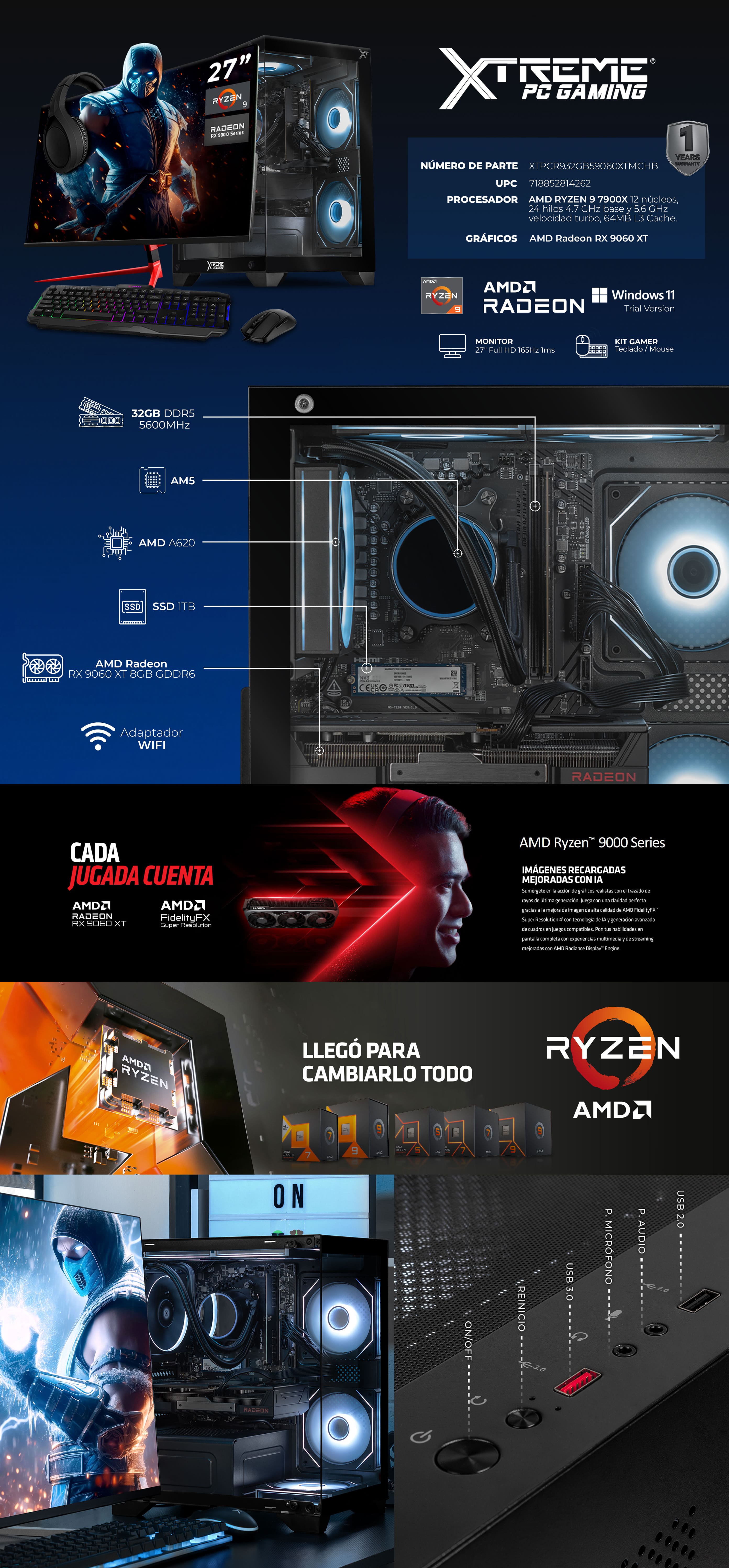 La Xtreme Ultra combina lo mejor de la nueva generación en una PC lista para el futuro. Con la potencia impulsada por IA de la AMD Radeon RX 9060 XT, el procesador AMD Ryzen 9 7900X y la tarjeta madre A620 AM5, disfruta de gráficos ultrarrealistas, FPS altísimos y multitarea sin límites para gaming y creación de contenido profesional.