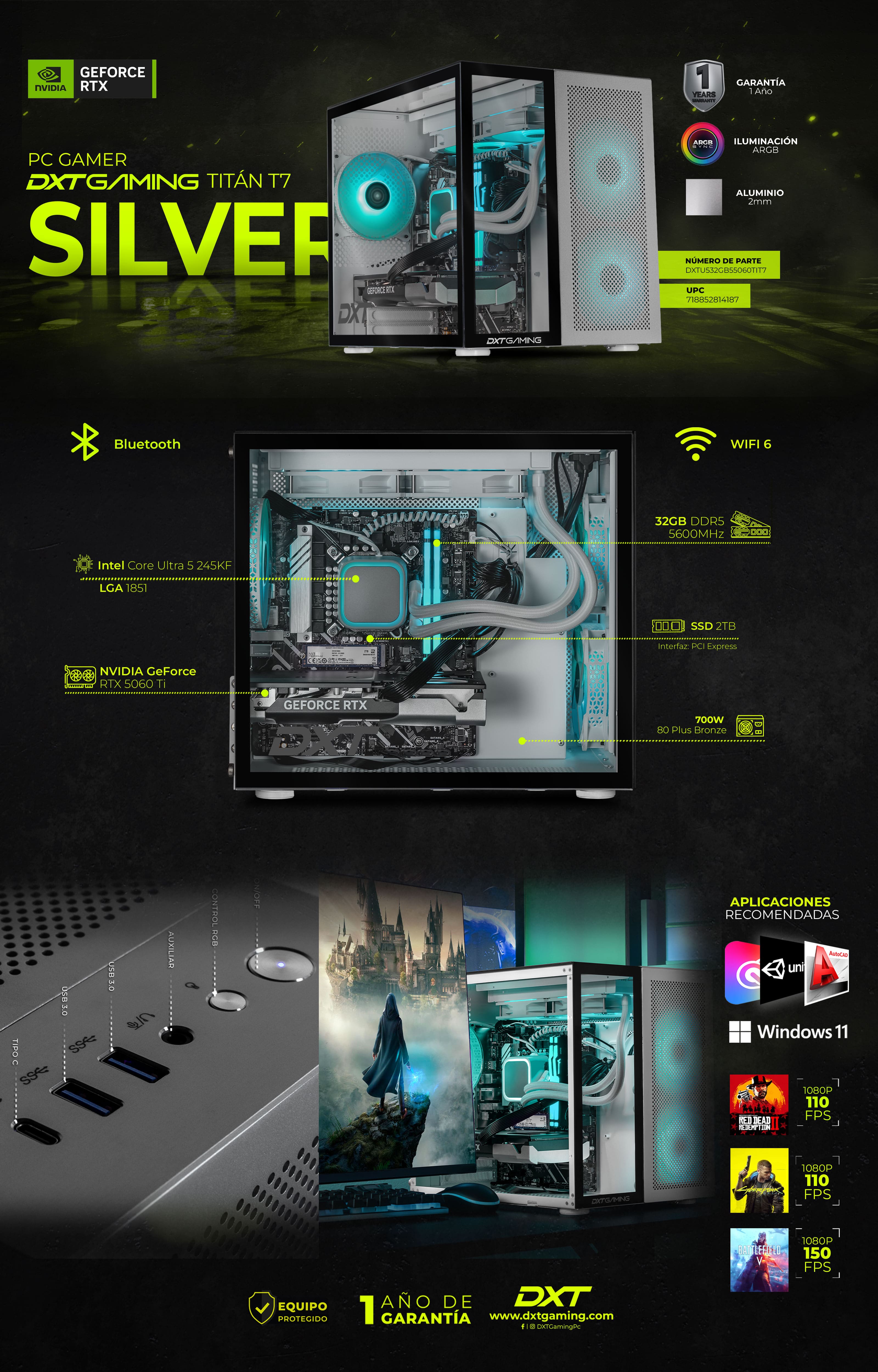 La DXT Core es la elección ideal para dar el salto al gaming serio. Equipada con la NVIDIA RTX 5060 Ti, el procesador Intel Core Ultra 5 245KF y la tarjeta madre H810, brinda fluidez en títulos como Fortnite, Valorant o Warzone con gráficos detallados en 1080p.