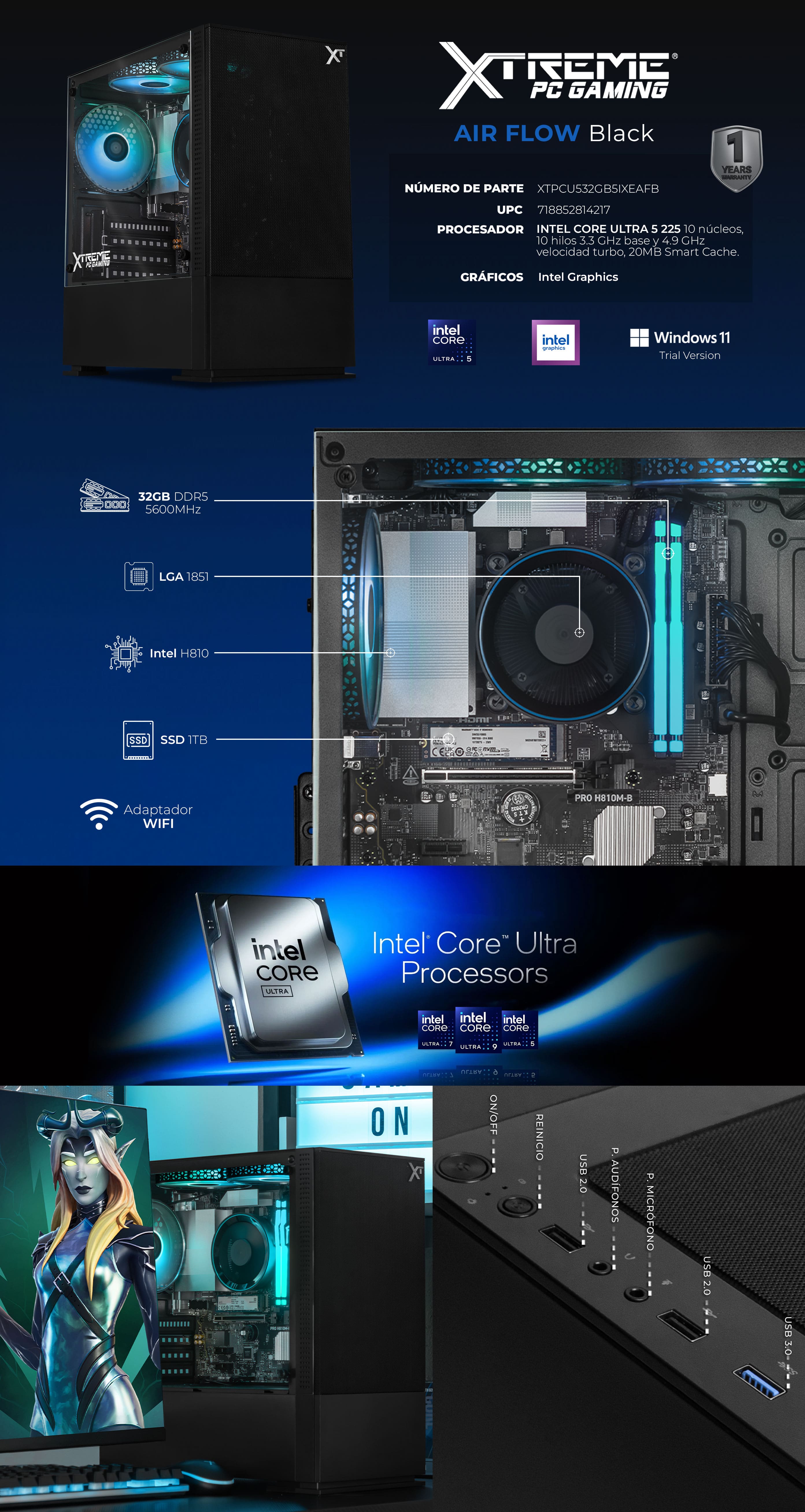 La Xtreme Core es la elección ideal para dar el salto al gaming serio. Equipada con el procesador Intel Core Ultra 5 225 y la tarjeta madre H810, brinda fluidez en títulos como Fortnite, Valorant o Warzone con gráficos fluidos en 1080p.