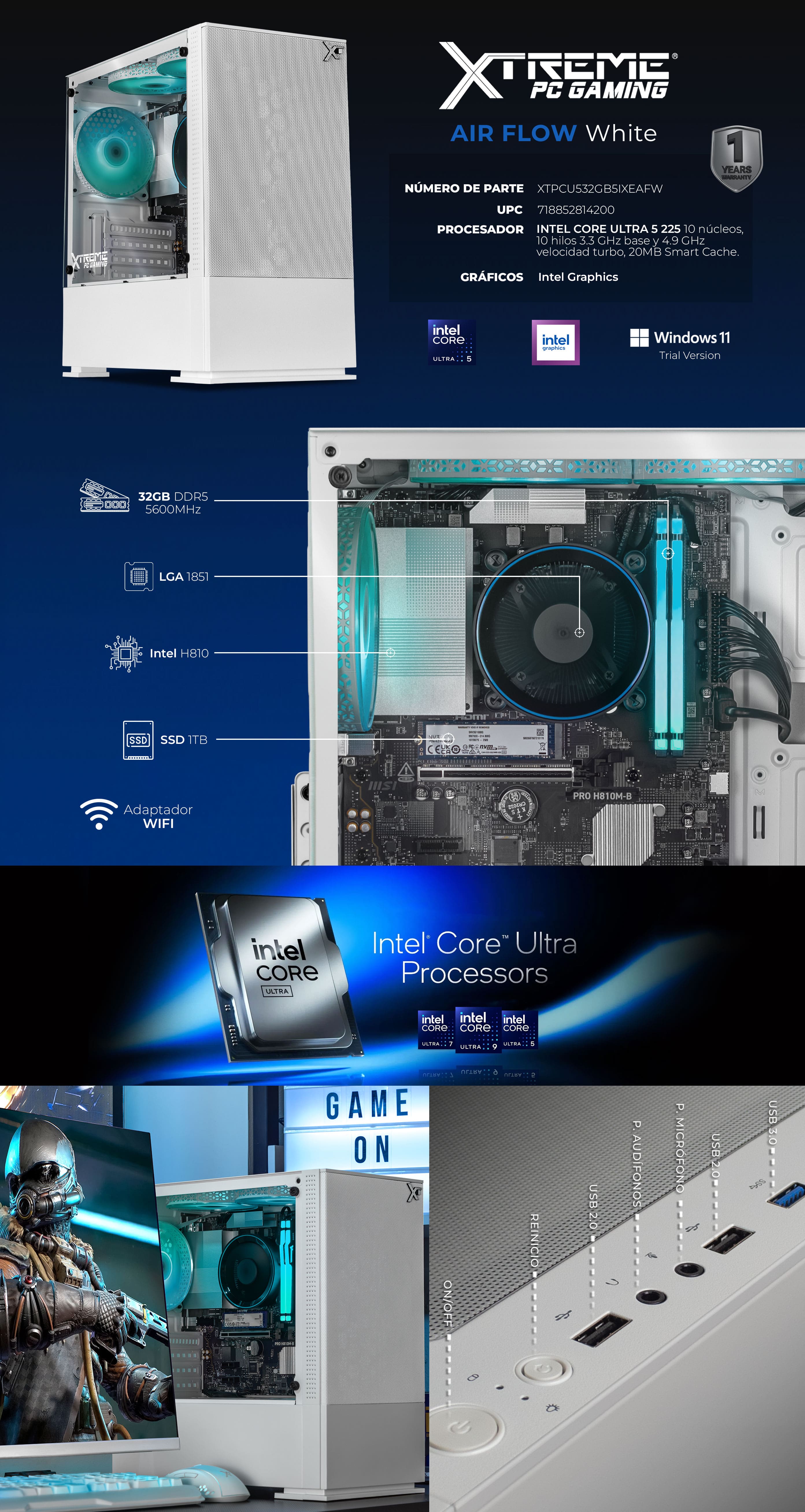 La Xtreme Core es la elección ideal para dar el salto al gaming serio. Equipada con el procesador Intel Core Ultra 5 225 y la tarjeta madre H810, brinda fluidez en títulos como Fortnite, Valorant o Warzone con gráficos fluidos en 1080p.