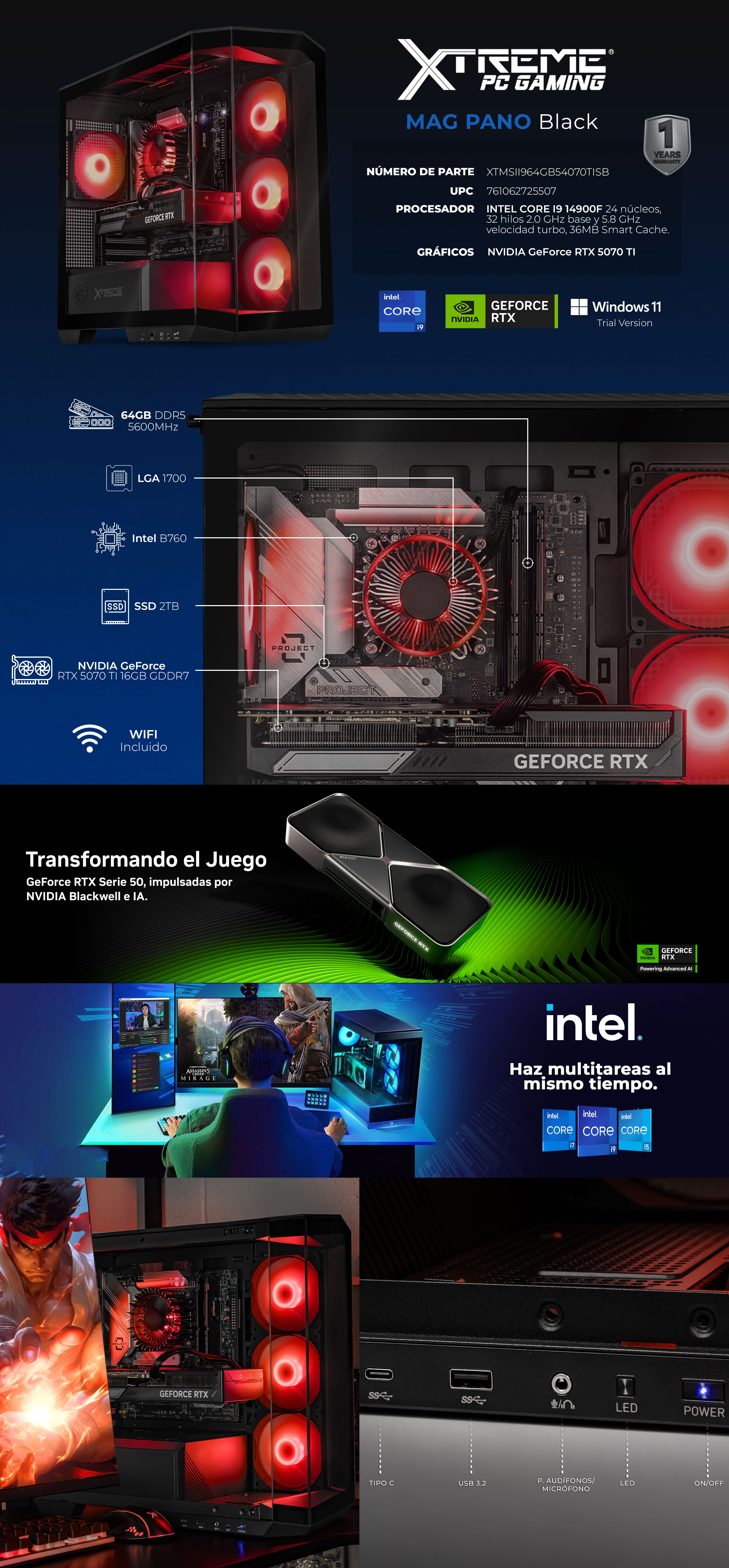 Xtreme PC Gaming MSI Geforce RTX 5070 TI Intel Core I9 14900F 64GB DDR5 SSD 2TB WIFI Black