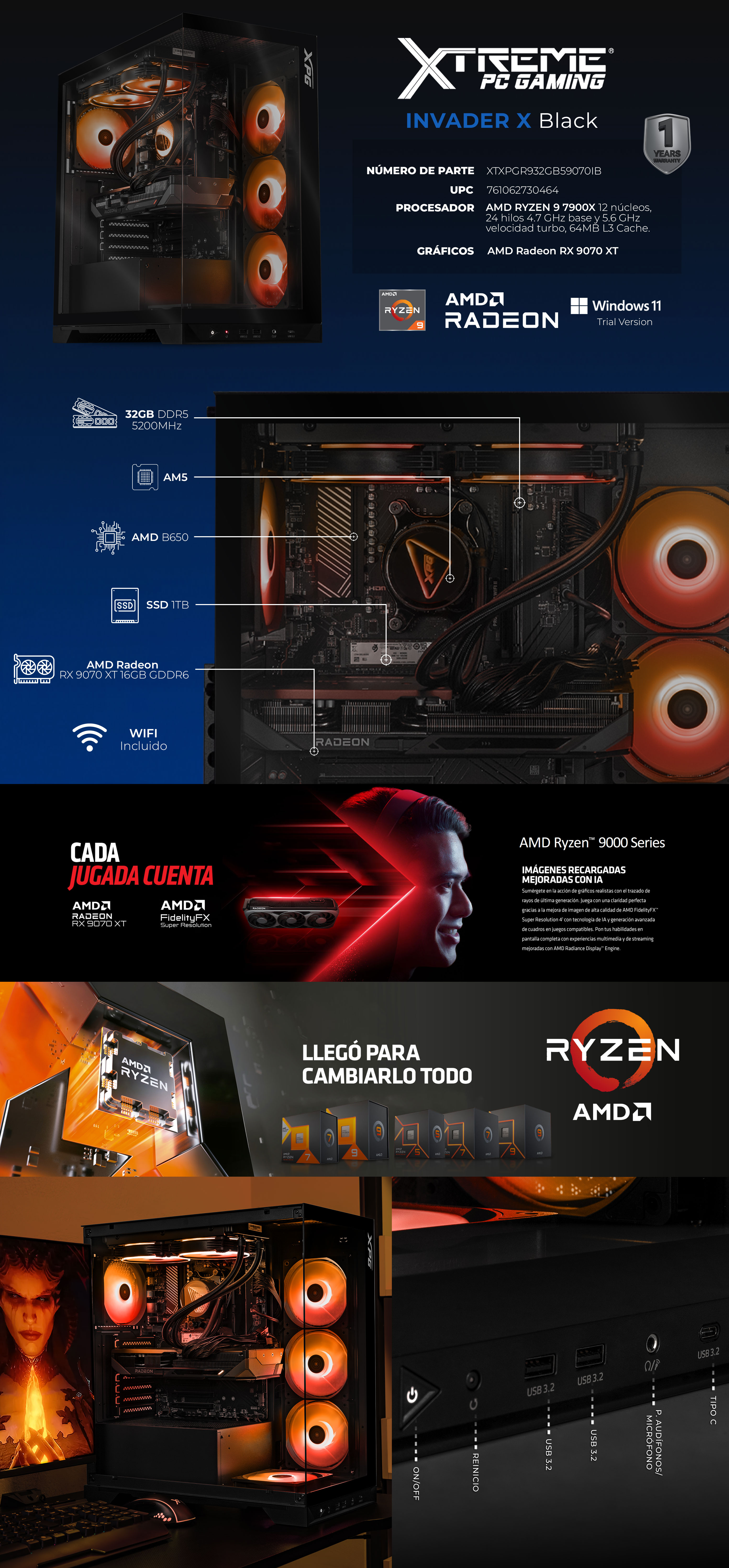 La Xtreme Ultra combina lo mejor de la nueva generación en una PC lista para el futuro. Con la potencia impulsada por IA de la Radeon RX 9070 XT, el procesador AMD Ryzen 9 7900X y la tarjeta madre B650 AM5, disfruta de gráficos ultrarrealistas, FPS altísimos y multitarea sin límites para gaming y creación de contenido profesional.
